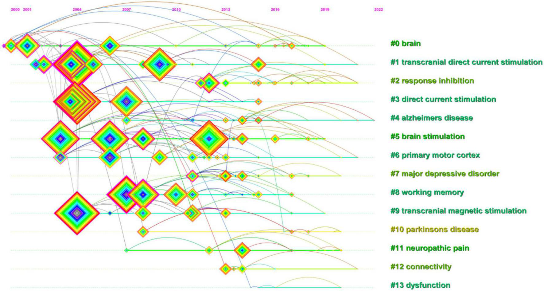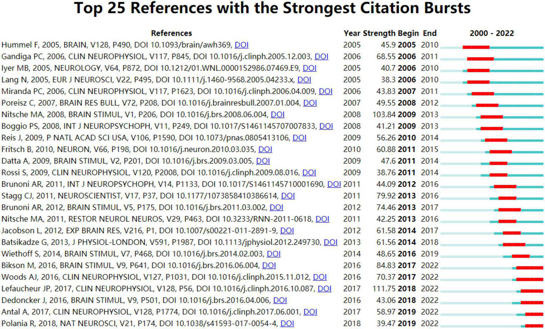 A total of 4,756 publications on tDCS fulfilled the criteria we designed and then were extracted from the WOSCC. The United States (1,190 publications, 25.02%) and Harvard University (185 publications, 3.89%) were the leading contributors among all the countries and institutions, respectively. NITSCHE MA and FREGNI F, two key researchers, have made great achievements in tDCS. Brain Stimulation (306 publications) had the highest number of publications relevant to tDCS and the highest number of citations (4,042 times). In terms of potential hotspots, we observed through reference co-citation analysis timeline viewer related to tDCS that “depression”#0, “Sensorimotor network”#10, “working memory”#11, and “Transcranial magnetic stimulation”#9 might be the future research hotspots, while keywords with the strong burst and still ongoing were “intensity” (2018–2022), “impairment” (2020–2022), “efficacy” (2020–2022), and “guideline” (2020–2022).