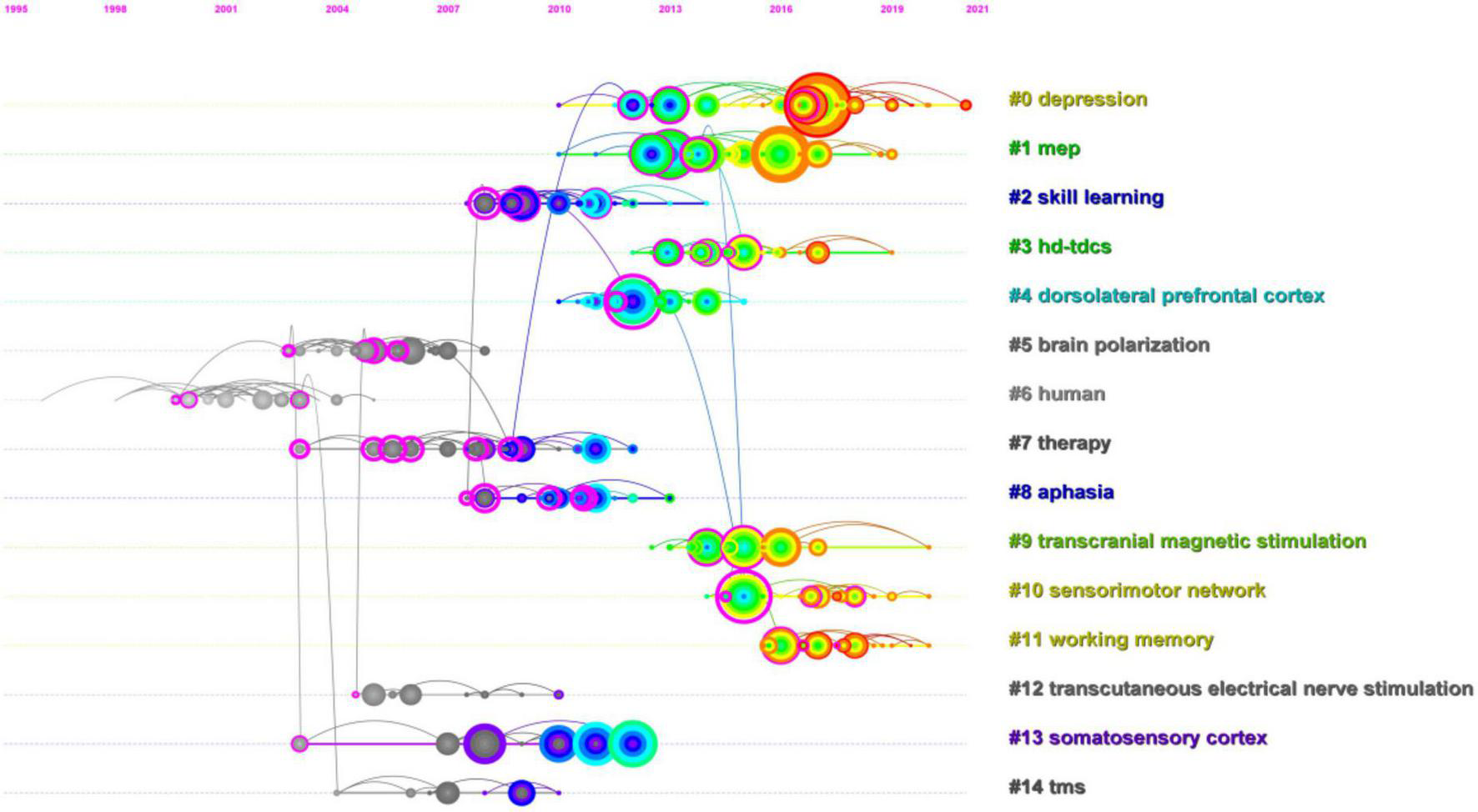 “Centrality” in CiteSpace refers to intermediary centrality, which is an indicator to measure the importance of nodes in the network (Wang et al., 2020). We can use this index to discover and measure the importance of literature, and then CiteSpace applies a purple circle to highlight such literature (or authors, journals and institutions, etc., and node-intermediary centrality with purple is not less than 0.1). The greater the proportion of the purple circle to nodes is, the higher the centrality. Significantly, a country or an institution with high mediational centrality is often the key junction connecting two different fields, which is also called a turning point in CiteSpace. If the centrality of a node exceeds 0.1, it indicates that the node is a central node that is relatively important and has great influence in the field. Spain (167 publications) ranked 10th in terms of the number of articles published on tDCS, while it was with the highest centrality (1.34) among the top ten countries. Economic strength is an important factor affecting scientific output, and it is worth mentioning that eight of these countries among the top ten countries were developed countries and only two (i.e., China and Brazil) were developing countries. From this point of view, there was still a wide gap between developed countries and developing countries in this field. The centrality of University of São Paulo reached 0.75, which meant that it was the most important hub, followed by University of Göttingen (centrality = 0.47) and Harvard University (centrality = 0.42). Shanghai Jiao Tong University, University of Ghent, University of Calgary, Max Planck Institute for Human Cognitive & Brain Sciences, Center for Addiction & Mental Health, and University Leipzig have been active since 2021.