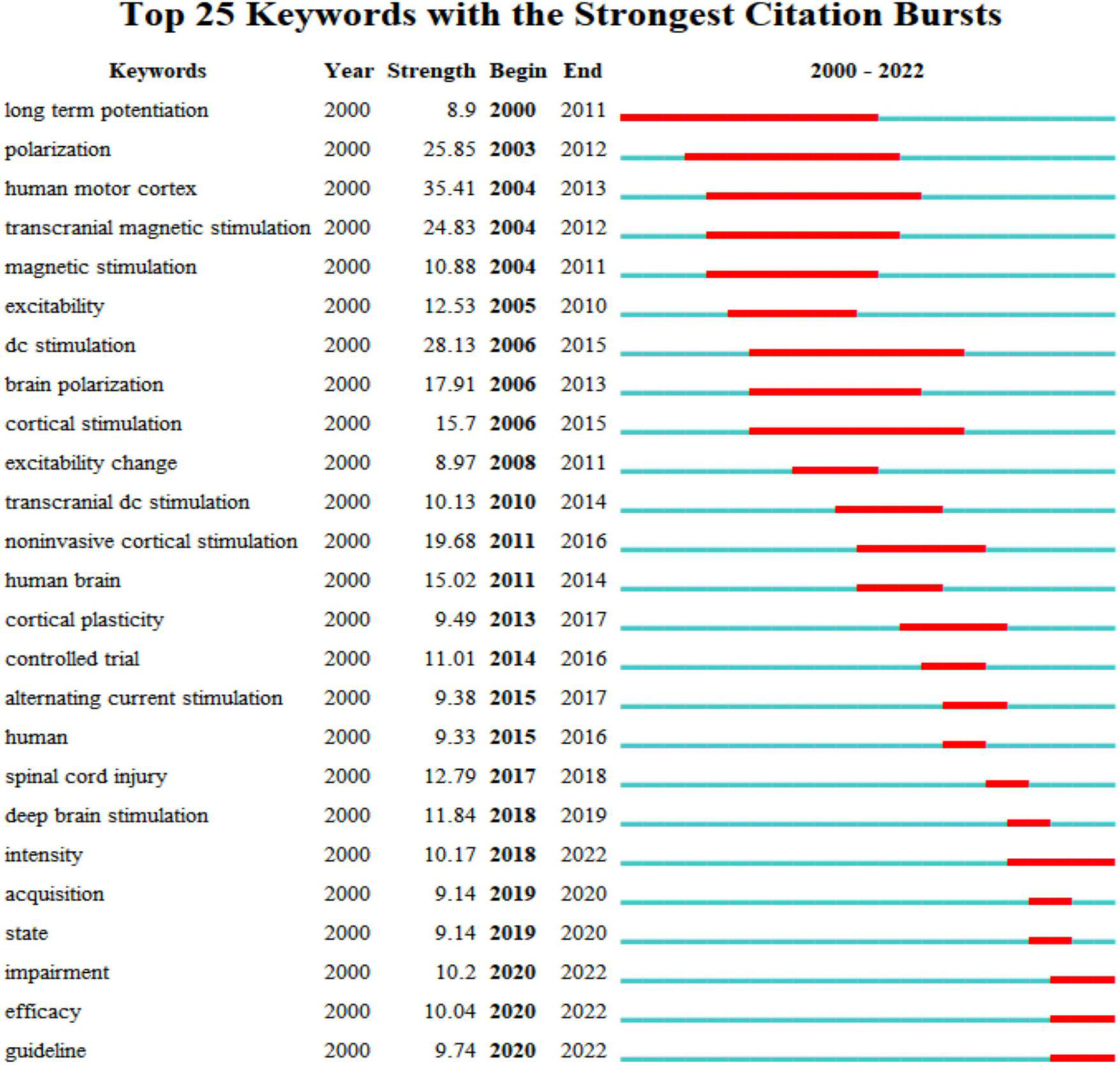 A considerable number of scholars and academic journals have been focusing on research related to tDCS over the last 20 years. However, studies on trends of tDCS through a bibliometric analysis were rare. Based on documents relevant to tDCS from 2000 to 2022, we used CiteSpace to identify the publication patterns and emerging trends of this technique and gain new insights in order to guide future research and application.