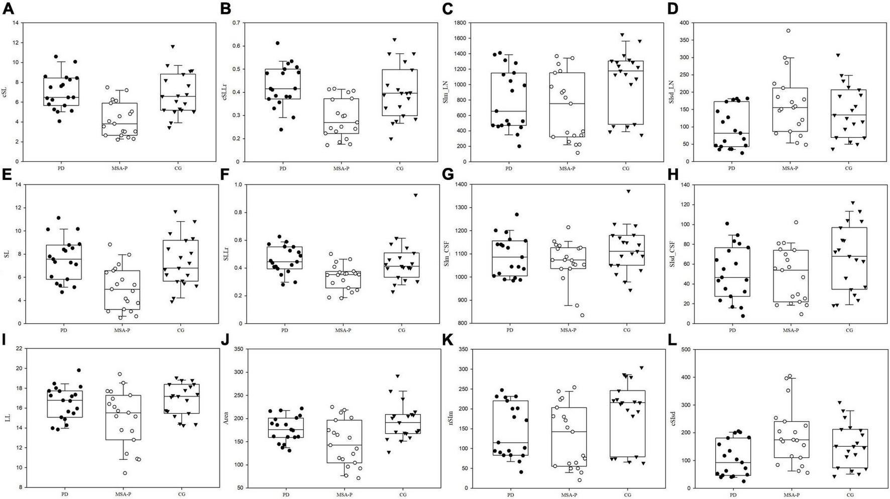 The box-scatter blot of the three groups with upper lower limit, upper lower quartile, and median line. The x-axis represents the three groups using different colors, and the y-axis represents the measured and calculated indexes. (A) corrected short line, cSL, (B) corrected short and long line ration, cSLLr, (C) mean signal intensity of lentiform nucleus, SIm_LN, (D) standard deviation of signal intensity of lentiform nucleus, SIsd_LN, (E) Short line, SL, (F) the ratio of short and long line, SLLr, (G) mean signal intensity of cerebrospinal fluid, SIm_CSF, (H) standard deviation of signal intensity of cerebrospinal fluid SIsd_CSF, (I) long line, LL, (J) Area, (K) normalized mean signal intensity, nSIm, and (L) corrected standard deviation of signal intensity, cSIsd.