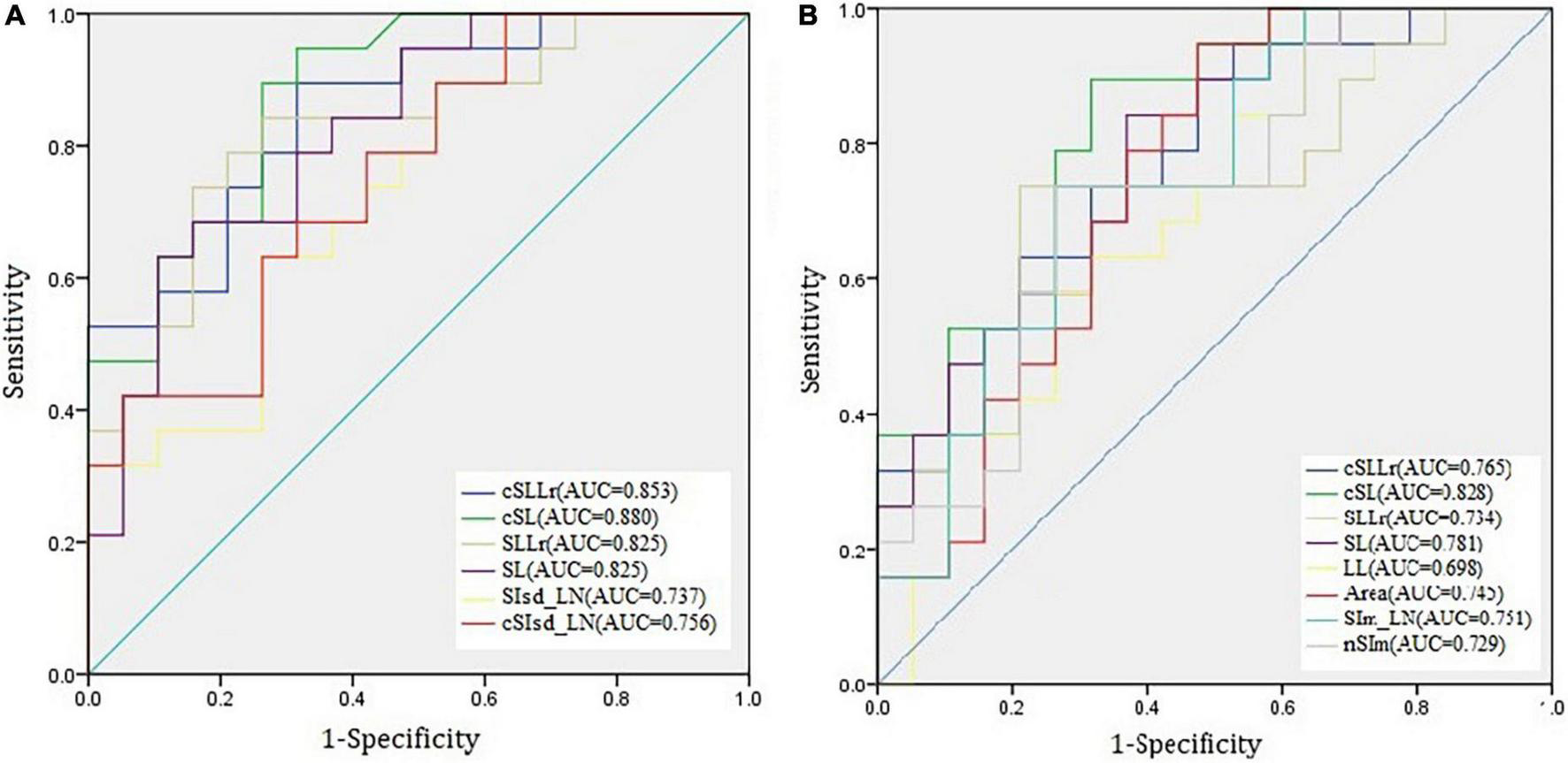 The receiver operating characteristic (ROC) curves of six indexes for multiple system atrophy-parkinsonian subtype vs. Parkinson’s disease (A) and eight indexes multiple system atrophy- parkinsonian subtype vs. control group (B).
