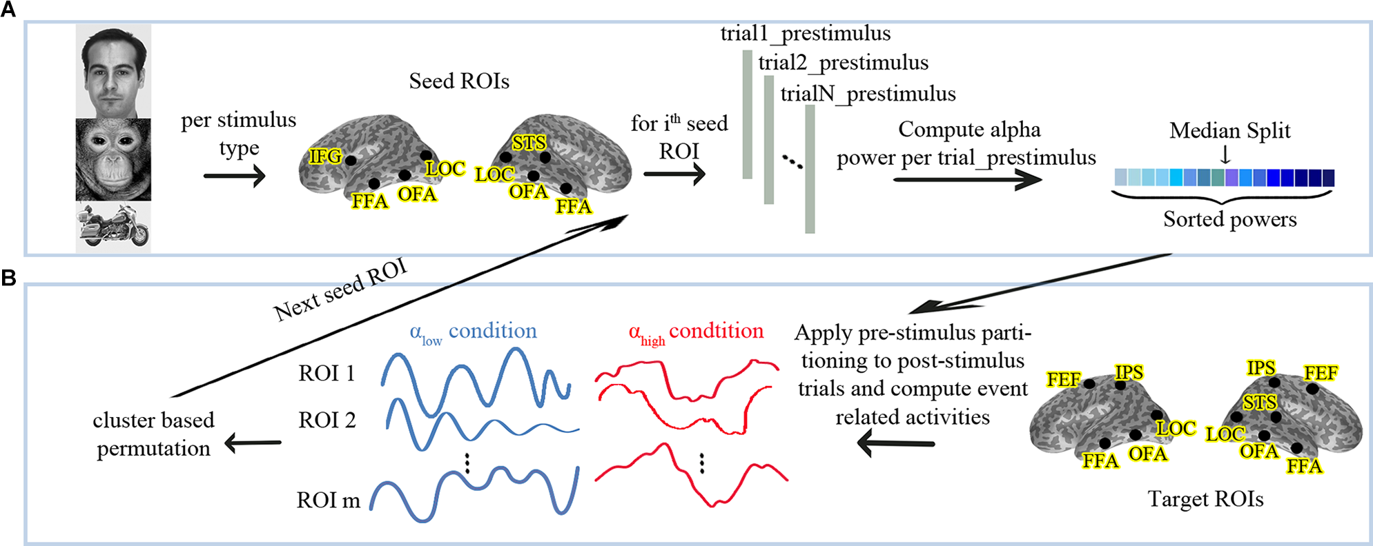 Time-frequency analyses were performed using a Morlet wavelet for the pre-stimulus interval from 1,300 ms to 0 ms using second-order detrending, zero-padding (to 4,000 ms), a wavelet width of seven cycles, in time steps of 25 ms, and frequency steps of 1 Hz. This resulted in a four-dimensional matrix (trials, ROIs, frequency bins, time bins) in which the power was computed for each trial, three time-courses of each ROI, each frequency bin, and each time bin. Alpha (8–13 HZ) power was separately estimated for each trial and ROI as the mean over the power values of the relevant frequency bins, all time bins and all the three time courses. Next, we divided the trials into two conditions based on the median of the pre-stimulus alpha power in each of the seed ROIs. This has been done separately for each participant’s data set and led to the creation of the two conditions; low and high pre-stimulus alpha power (αlow vs. αhigh). Figure 1A represents the partitioning pipeline in this study. The same categorization was applied to the post-stimulus periods of all first stimuli. We averaged the event-related activity following the first stimuli separately for both conditions, all target ROIs and the three stimulus categories. The second stimulus presentations are not reported here as they represent an even longer pre-to-post-stimulus time interval and additionally depend on the processing of the first stimuli.