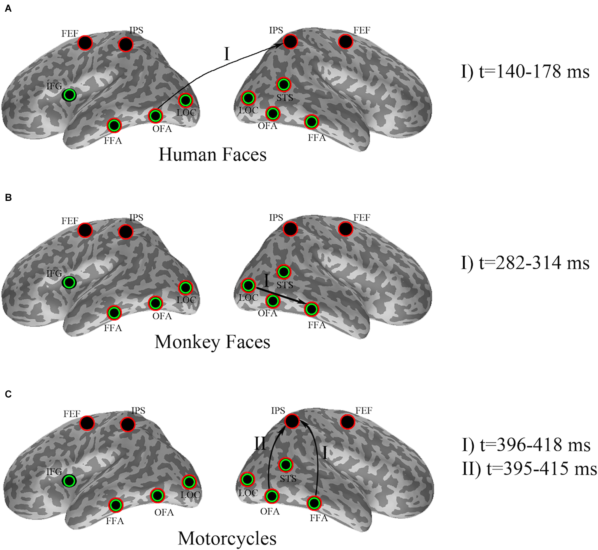 Effect of pre-stimulus alpha power on evoked responses for (A) human faces, (B) monkey faces, and (C) motorcycles. Seed ROIs were marked with green circles, whereas red circles specified the target ROIs. Arrows indicate significant effects, where pre-stimulus alpha-power in a seed region (beginning node in each directional connection) modulates the evoked response in a target region (ending node of that connection). The time intervals at which the significant dissociations were recognized by cluster-based permutation have been added as the legend.