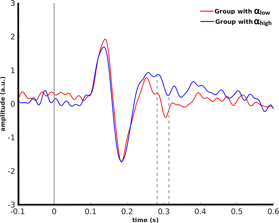 Grand average over the participants’ evoked responses to human faces in the right IPS for the αlow vs. the αhigh conditions. Dashed lines indicate the time interval at which the difference between the two conditions was found to be significant by cluster-based permutation.