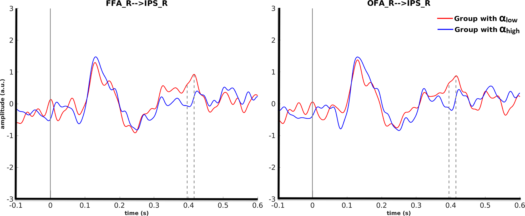 Grand average over the participants’ evoked responses to motorcycles stimuli for the αlow and αhigh conditions in the right IPS. The left columns represent the time courses when FFA was considered as the seed ROI and the right column is with regard to OFA as the seed ROI.