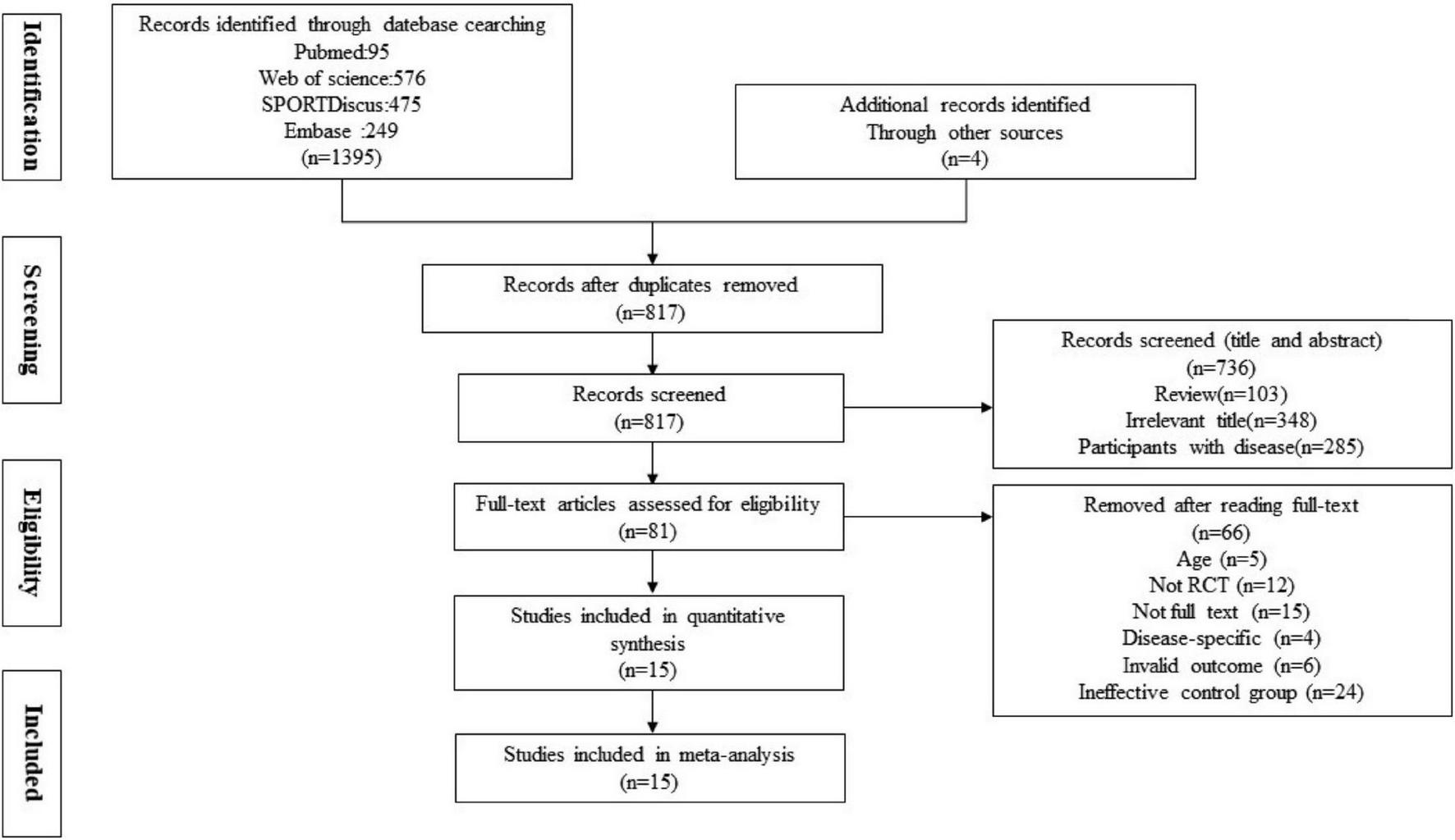 The flow of the study identification and selection process is summarized in Figure 1. The systematic search yielded 1,384 records: PubMed (n = 105), Web of Science (n = 570), SPORT-Discus (n = 56), MEDLINE (n = 428), EMBASE (n = 249), and Manual Search (n = 4). A total of 565 repetitive publications were excluded, leaving 819 articles. Then, 786 irrelevant articles were excluded by title and abstract, which consist of 33 publications with full text. Next, these 33 articles were further evaluated by reviewing the whole article, and 18 of them were excluded. Therefore, 15 publications were identified for inclusion in the systematic review and meta-analysis.