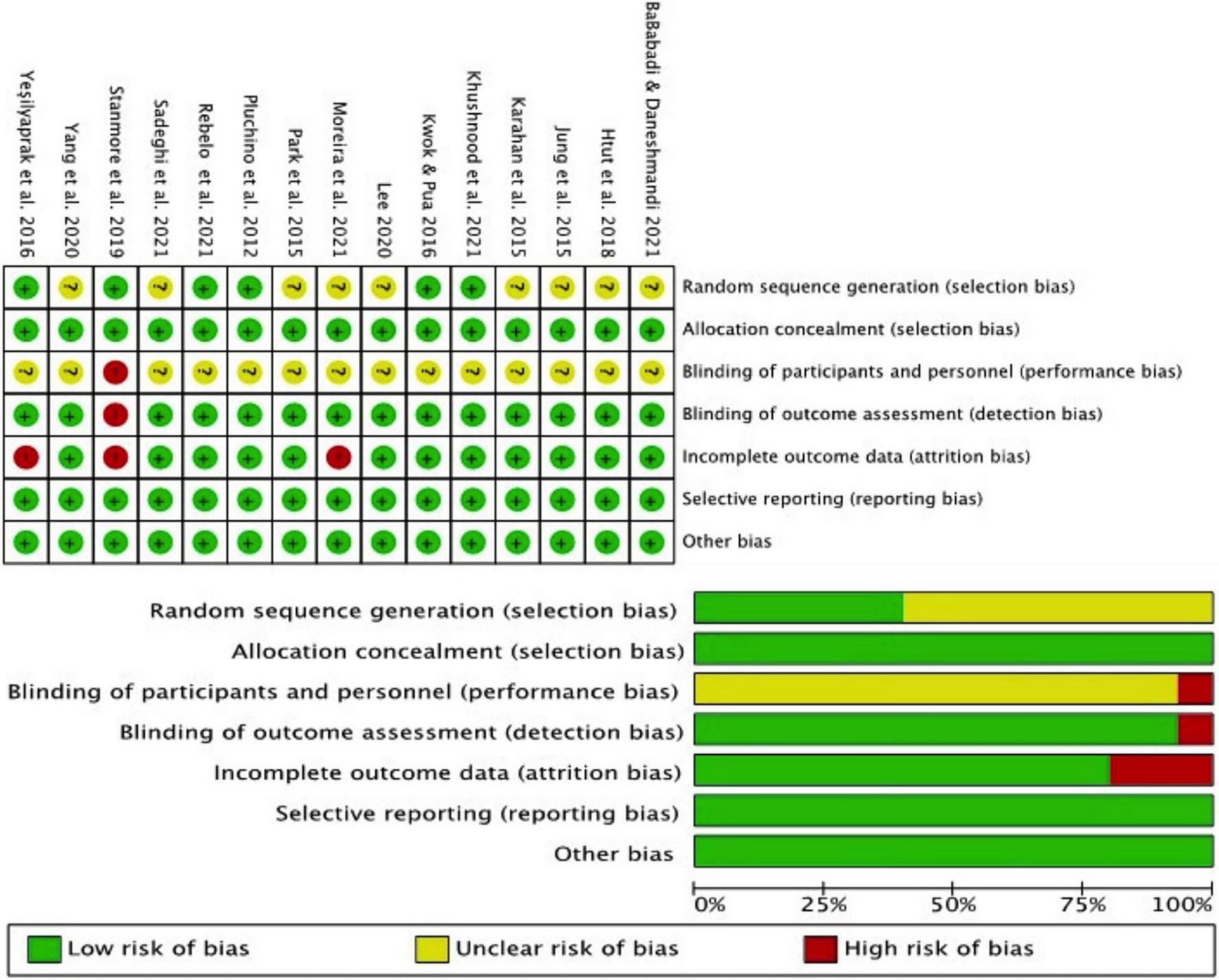 The result of the Cochrane risk of bias tool is summarized in Figure 2. The overall quality of the included articles was good. Most of the studies did not blind the participants, supervisors, or testing personnel. All the studies were at unclear or high risk of bias in at least one of the domains and were considered to be at possible risk of bias.