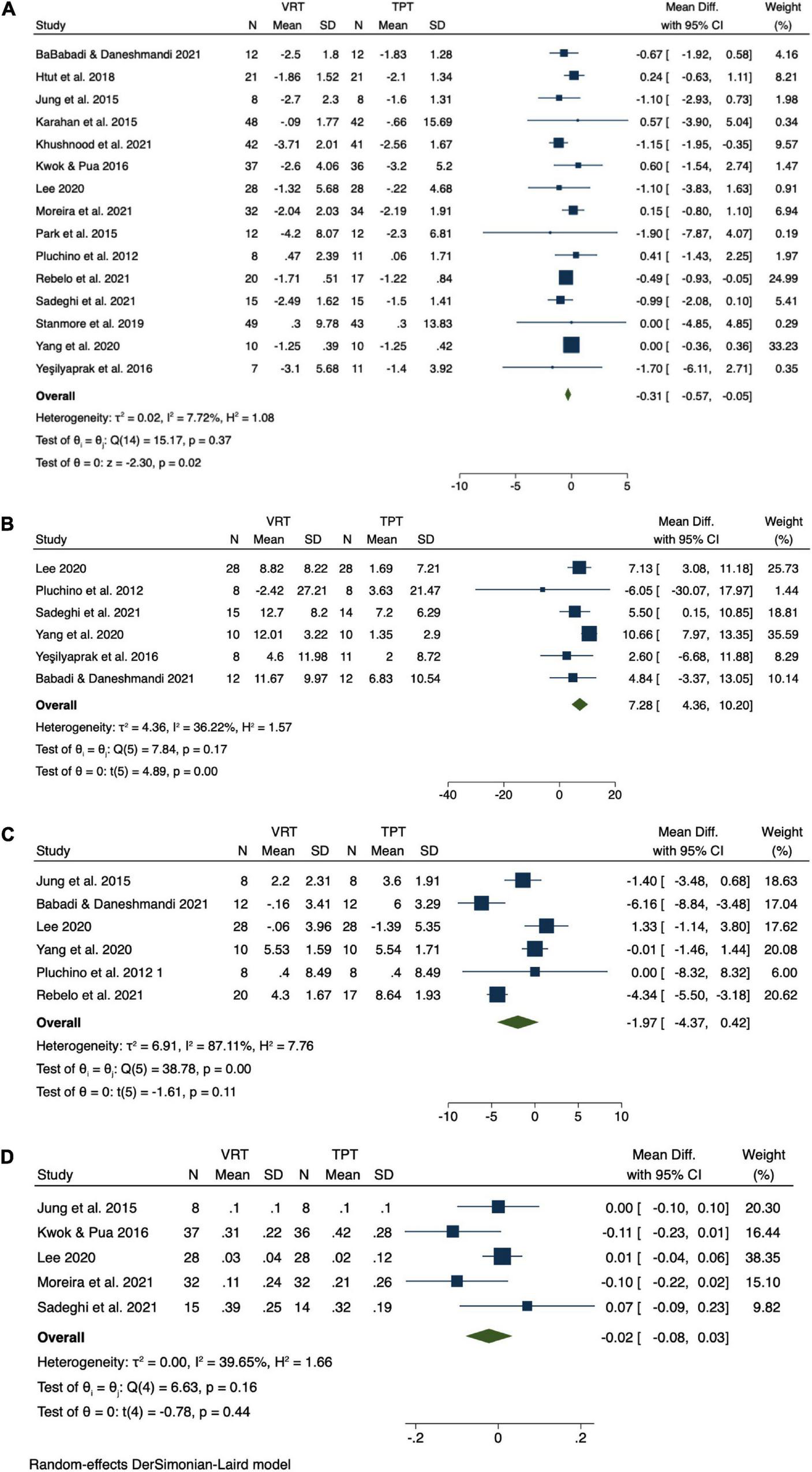 However, significant variance in the design of study protocol (e.g., number of intervention sessions) and the characteristics of the VR system (e.g., immersive or not) were presented in the published study, which lead to the inconsistent observations in the effects of VRT on functional mobility and balance. Babadi and Daneshmandi (2021) observed that, e.g., a 9-week Xbox Kinect intervention significantly improved the time to complete the Timed Up and Go test (TUG), compared to TRT; but Stanmore et al. (2019) observed in another study that a 12-week Xbox Kinect intervention cannot induce greater improvement in TUG time in older adults who lived in nursing homes compared to TPT. Neri et al. (2017) completed a meta-analysis in 2017 and observed the benefits of VRT on balance and functional mobility in older adults as compared to the control (i.e., those who were inactive without doing PT). However, the risk of bias of this meta-analysis was relatively high, the number of the included studies was very limited (only six studies), and the observation of that study, thus, needs to be considered with caution. Additionally, since 2017, VR has been increasingly applied to older adults with the fast advances in VR technology (Phu et al., 2019) and many more studies have emerged. It is, thus, highly demanded to better characterize the efficacy of VRT on balance and functional mobility in older adults.
