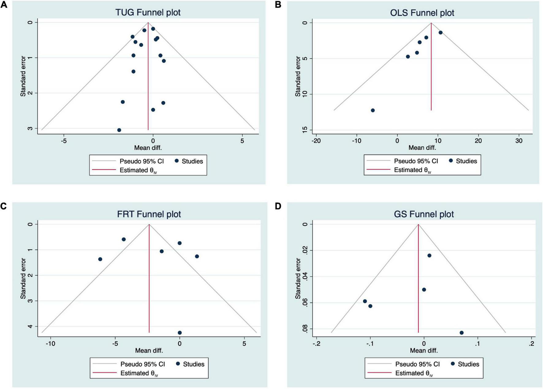 Revman 5.3 software (Cochrane Collaboration, Oxford, United Kingdom) and Stata version 16.0 (Stata Statistical Software, release 16; Stata Corp., College Station, TX, United States) were used for data synthesis and analysis. Continuous data were analyzed using the inverse variance approach by combining the mean difference (MD) of individual studies. The MD was calculated as the mean difference of the outcomes in the intervention group before and after the intervention minus the mean difference of the outcomes in the control group before and after the intervention (Cohen, 2013). The statistical heterogeneity was evaluated using heterogeneity chi-squared (χ2) and I2 values. The level of heterogeneity was interpreted according to the guidelines from Cochrane’s collaboration: I2 values of 25, 50, and 75% correspond to low, moderate, and high heterogeneity, respectively (Higgins et al., 2003). A random-effect model was used to conservatively estimate the pooled effect in anticipation of heterogeneity across individual studies due to differences in participant and intervention characteristics. In addition, publication bias was assessed by generating funnel plots and conducting Egger’s test. If significant asymmetry was detected (Egger’s test p < 0.1), we estimated the magnitude of the small study effect using the Trim and Fill method (Duval and Tweedie, 2000). Statistical significance was set at p < 0.05.