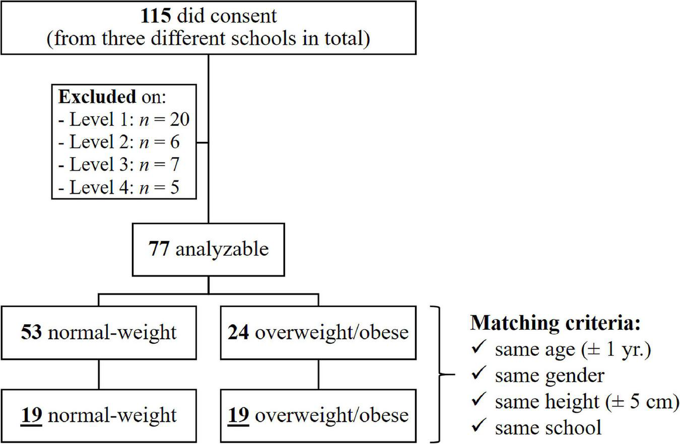 The detailed participant selection process and the participants’ characteristics are presented in Figure 1 and Table 1. In sum, 38 out of the 115 10–16-year-old YO and YN had to be excluded for further analysis due to medical, personal, or technical reasons. Of the remaining 77 children, 24 were overweight or obese, while 53 were normal-weight. In the end, 19 (overweight, n = 9; obese, n = 10) out of 24 of the YO could be a posteriori strictly age-, sex-, height-, and school-matched to a YN control, thus leaving 38 children to be thoroughly evaluated. Age- and sex-specific body mass index percentiles for classifying weight status among children were computed using the online calculator provided by the Centers for Disease Control and Prevention1 : normal-weight, 5th ≤ BMI < 85th percentile; overweight, 85th ≤ BMI < 95th percentile; obese, BMI ≥ 95th percentile). No child stated to have ever been involved in a weight loss or obesity treatment program.