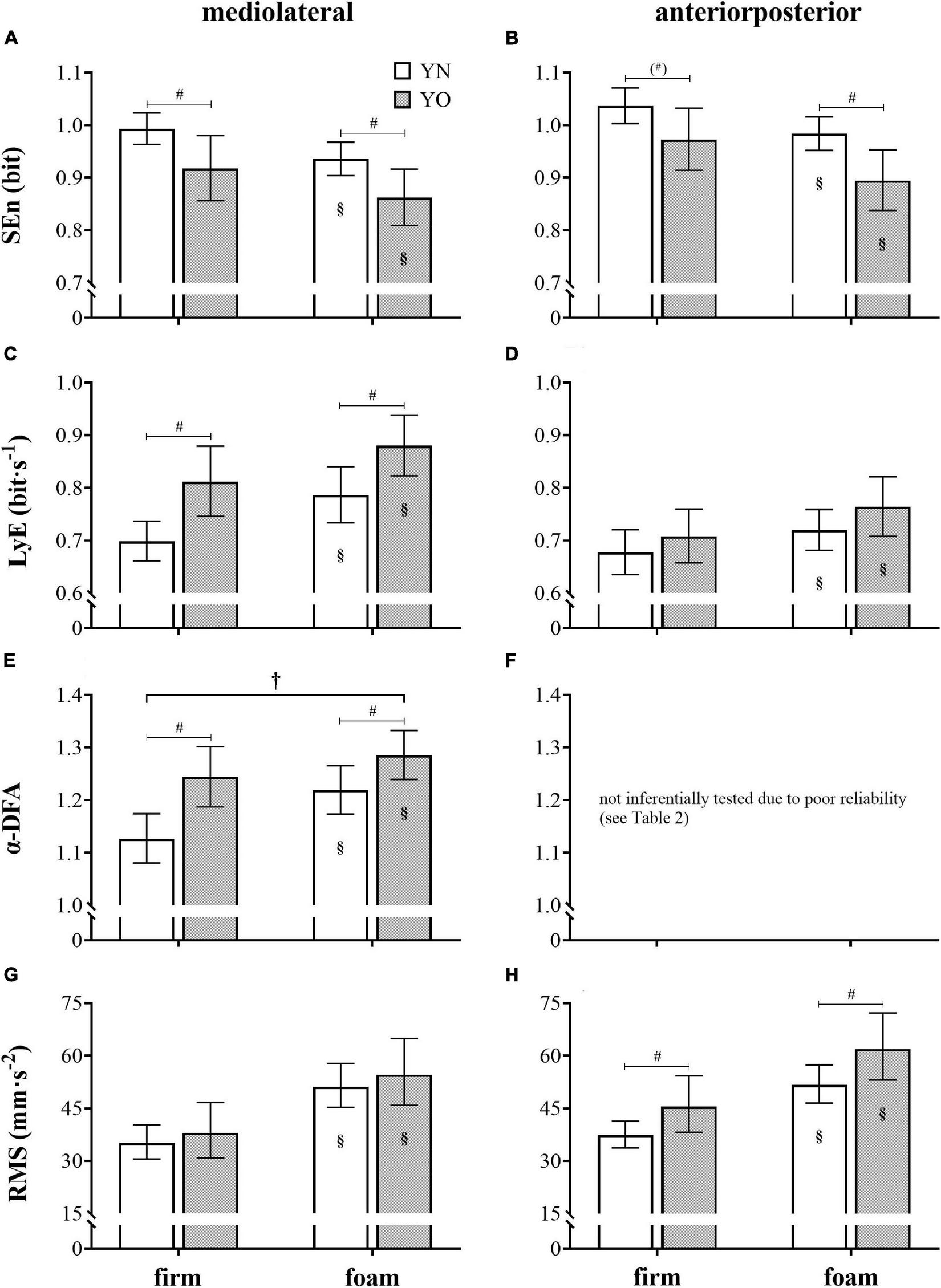 Since single non-linear metrics cannot comprehensively quantify the complexity of a one-dimensional time series (e.g., Goldberger et al., 2002; Stergiou and Decker, 2011), the application of three complementary mathematical tools is a strength of our study. In this way, we reveal the overall impression of the temporal organization of the sway signal while reducing the risk of misinterpretations. Considering the earlier findings described above, we expected a reduced postural complexity in terms of higher repeatability (lower SEn values), lower local stability (higher LyE values), and higher long-range correlation (higher α-DFA values) in YO compared to their YN peers. Further, we hypothesized that this functional deficit would become even more evident in the foam standing condition. Since sway data were captured using simple accelerometry within a non-laboratory setting, we also tested the reliability of the methodology employed.