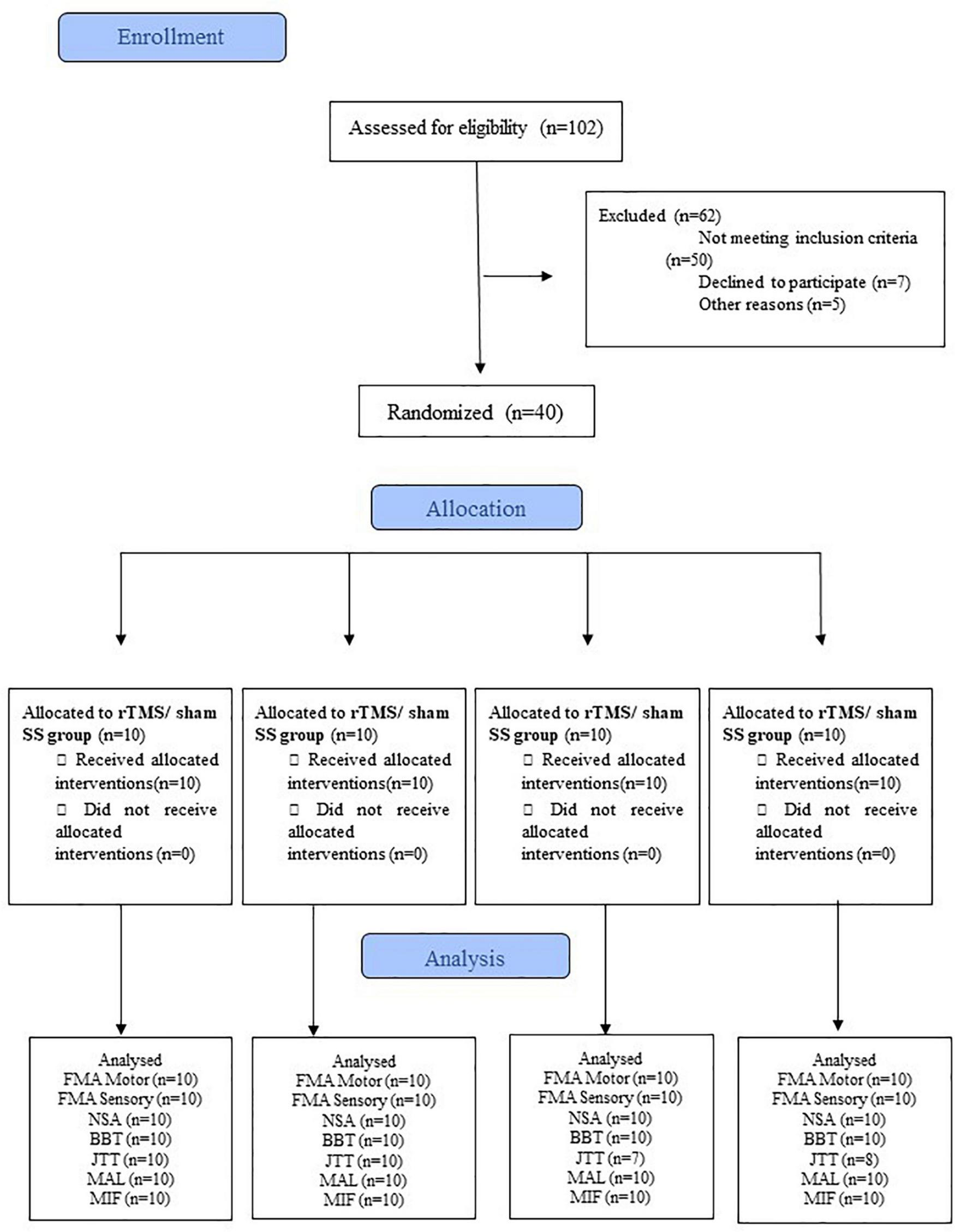 CONSORT flowchart of the study. BBT, Box and Block test; FIM, Functional Independence Measure; FMA-Motor, upper limb Fugl-Meyer for motor function; FMA-Sensory, upper limb Fugl-Meyer assessment for sensory function; JTT, Jebsen-Taylor Hand Function Test; MAL, Motor Activity Long test;. NSA, Nottingham Sensory Assessment; SS, Sensory Stimulation. rTMS, repetitive Transcranial Magnetic Stimulation.
