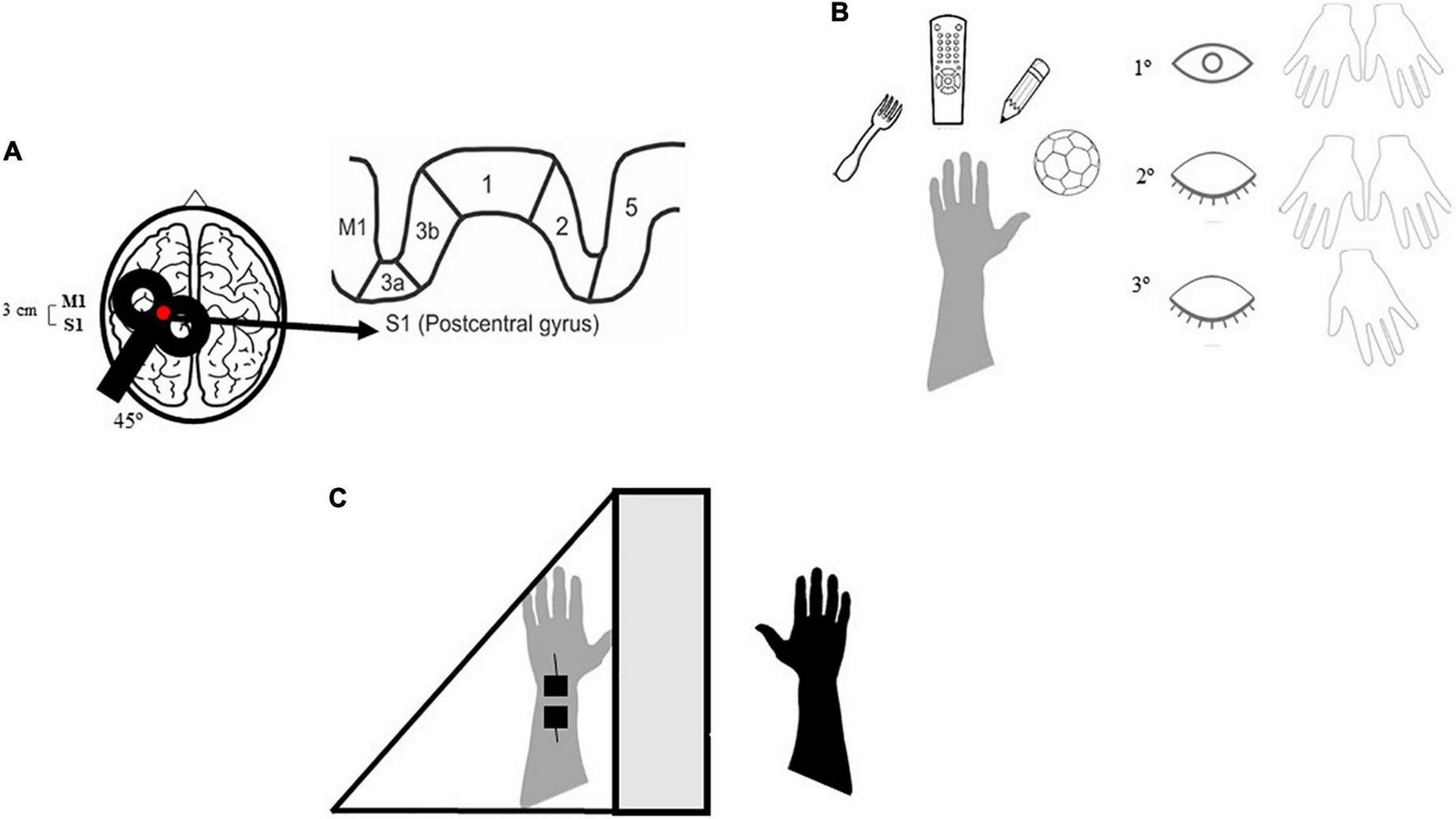 Demonstration of the therapeutic environment of repetitive transcranial magnetic stimulation (rTMS) and sensory stimulation. M1, primary motor cortex; S1, primary somatosensory córtex. Participants who were part of the active rTMS/SS group received 20 min of rTMS over S1 followed by the active sensory training: the participant has to haptically explore different textures of familiar objects and to recognize their different characteristics. First with both hands (intramodal calibration) and eyes open (cross-modal calibration) then using only the affected hand and eyes closed (Carey et al., 2011). Firstly, we required to explore the object with eyes closed and both hands, then with only the affected hand and eyes closed. The final part of the training consisted in Mirror Therapy in addition to transcutaneous electrical nerve stimulation (TENS). (A) rTMS on S1, 20 min. (B) Active sensory training, 20–25 min. (C) Mirror therapy/TENS, 40–45 min.