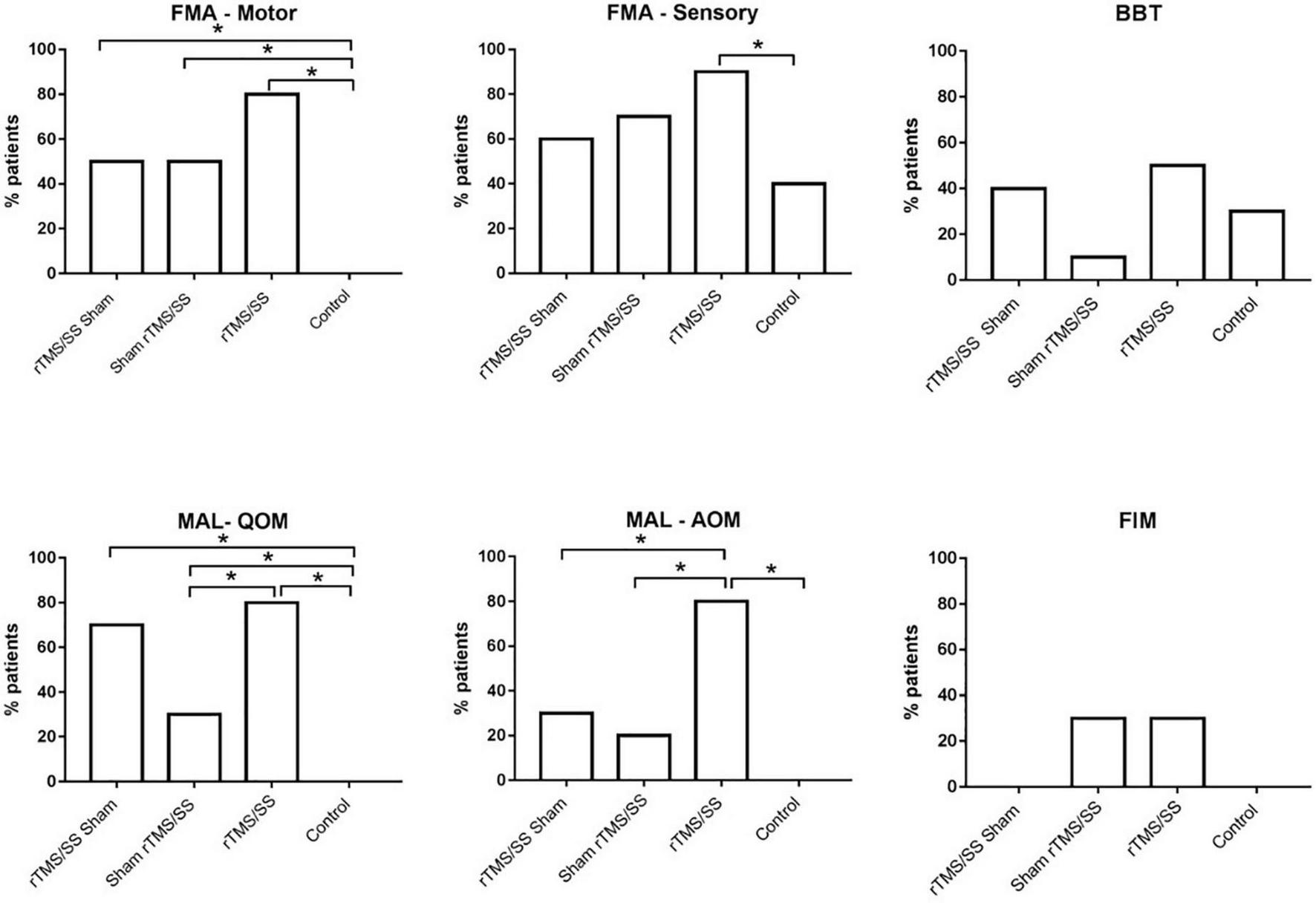 cOne-way ANOVA. The p-value represents the difference between groups. SS, Sensory Stimulation; rTMS, repetitive transcranial magnetic stimulation; BBT, Box and Block test; FIM, Functional Independence Measure; FMA, Fugl-Meyer assessment; JTT, Jebsen-Taylor Hand Function Test; MAL-QOM, the quality of upper limb movement of Motor Activity Long test; MAL-AOM, amount of upper limb movement of motor activity long test; MMSE, mini-mental state examination; NSA, Nottingham Sensory Assessment.