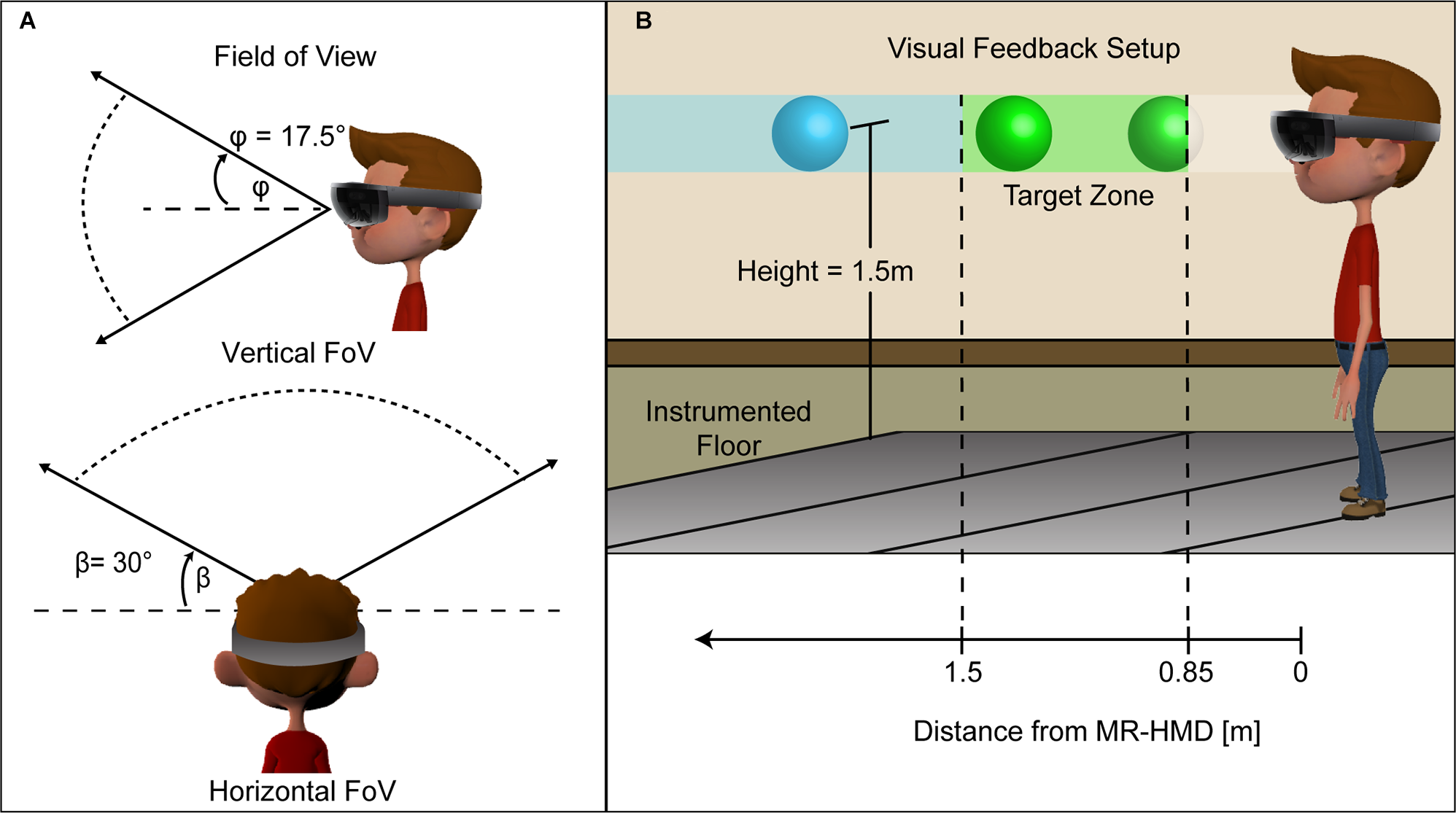 Visualization of the HoloLens MR-HMD. The image on the left (A) shows the vertical and horizontal field of view for rendered holographic objects. The visual feedback (B) consisted of a floating holographic ball in different sections based on distance from the HMD. When maintaining the target speed, the ball remains between 1.5 m and 0.85 m from the subject and is colored green. If the subject walked too slowly and the ball was beyond 1.5 m its color changed to blue providing additional feedback that the user should walk faster. The ball clipped when it was less than 0.85 m from the HMD indicating that the subject should walk more slowly.