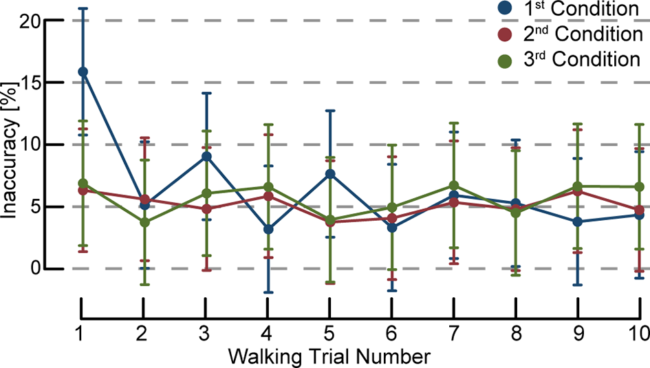 Walking speed inaccuracy percentage by trial number. The first condition using visual feedback is indicated in blue, the second tested condition in red, and third tested condition in green. Error bars denote 95% confidence intervals. The first overall trial regardless of speed condition had a larger percent inaccuracy compared with nearly all subsequent walking trials. The within-trial inaccuracy was 10.5% higher (CI95: 7.4, 13.5) in first trial of the first speed condition compared to subsequent trials. We found no significant differences in walking speed inaccuracy between the second and 10th trial of the first speed condition, or the 1st and 10th trial in the subsequent speed conditions. As the first trial overall appears to be an outlier due to a learning effect, we excluded that trial for the subsequent analyses.