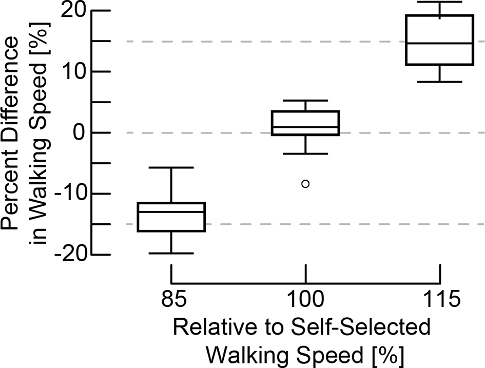Percent difference in walking speed: actual vs. target. A one-sample Wilcoxon signed-rank test found that actual walking speeds of the participants did not differ from the expected speeds during the SS85 (median difference from baseline: −13.8%, z = 0.63, p = 0.53), SS100 (median difference from 1.2%, z = 1.23, p = 0.23), and SS115 (median difference: 14.2%, z = 0.16, p = 0.88) conditions.