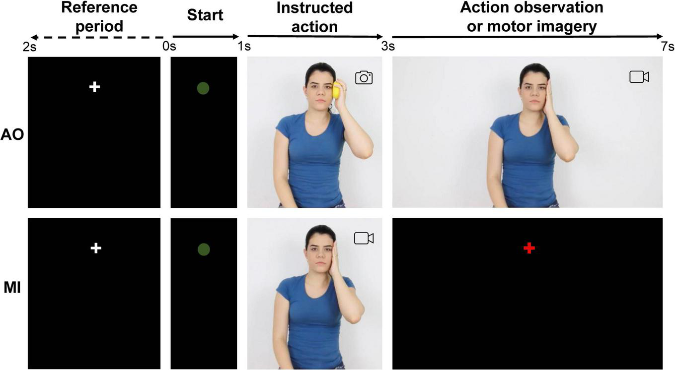 The participants in the MI condition watched a video of a female executant (instructed action) performing a rhythmical movement, and afterward imagined themselves performing the same action. The participants in the AO condition observed the image of an instructed rhythmical action, followed by a video of the executant performing the same action (see section “Experimental Conditions”). Unlike Eaves et al. (2016), the speed of instructed action was not manipulated and the participants did not verbally report (in AO) neither execute (in MI) the action in any trial. The cortical electrical activity of the participants was recorded using EEG during both conditions.