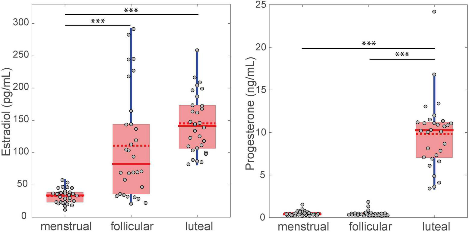Difference between FSS levels for the three menstrual cycle phases. The filled red line in the boxplot represents the median and the dotted red line represents the mean. ∗∗∗p < 0.001.