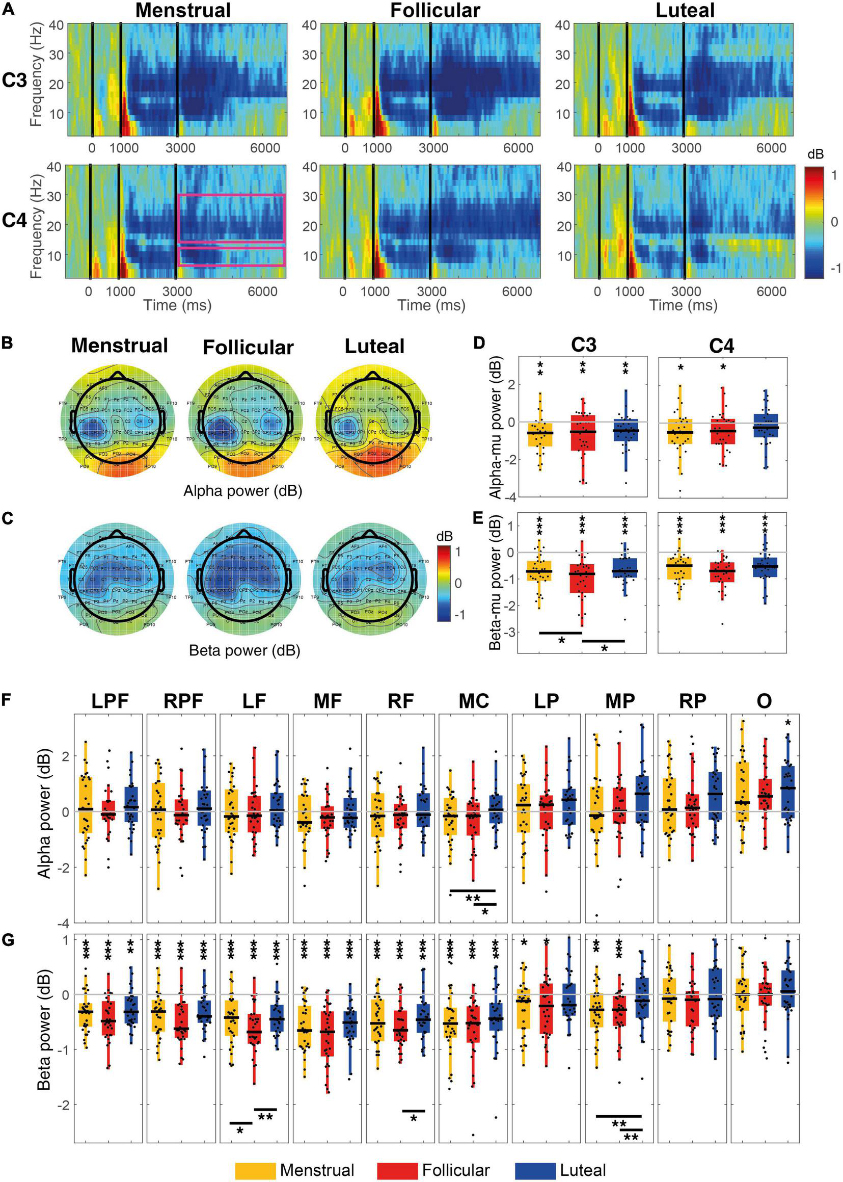 Event-related power for each menstrual cycle phase during the MI condition. (A) Displays time-frequency plots of C3 and C4 electrodes by menstrual cycle phase. The pink rectangles in the first column and C4 row indicate the time-frequency interest limits: Event B time (3.15–7 s), alpha-band (8–13 Hz), and beta-band (15–30 Hz). (B) Shows topographies of the mean alpha power for each menstrual cycle phase and (C) shows topographies of the mean beta power for each menstrual cycle phase. Boxplots and scatter plots are presented in (D) with alpha-mu power, in (E) with beta-mu power per menstrual cycle phase and per cortical region, in (F) with alpha power for various regions of the cortex, and in (G) with beta power for various cortex regions. Asterisks located above boxplots indicate that the power was significantly different from zero in the menstrual cycle phase below. Asterisks located below boxplots indicate that the power was significantly different between the two menstrual cycle phases indicated by the horizontal line. *p < 0.05, **p < 0.01, ***p < 0.001; C3, left central; C4,: right central; LPF, left prefrontal, RPF, right prefrontal, RF, right frontal, MF, medial frontal, LF, left frontal, MC, medial central, LP, parietal, MP, medial parietal, RP, right parietal and O, occipital.