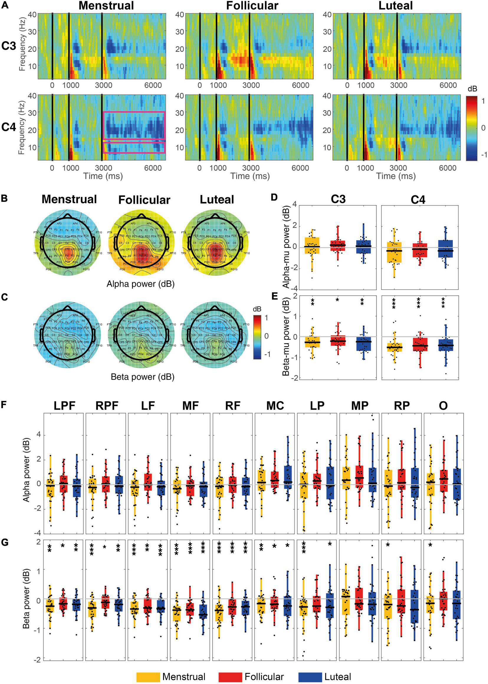 Event-related power for each menstrual cycle phase during the AO condition. (A) Displays time-frequency plots of C3 and C4 by menstrual cycle phase. The pink rectangles in the first column of the C4 row indicate the time-frequency interest limits: Event B time (3.15–7 s), alpha-band (8–13 Hz), and beta-band (15–30 Hz). (B) Shows topographies of the mean alpha power for each menstrual cycle phase. (C) Shows topographies of the mean beta power for each menstrual cycle phase. Boxplots and scatter plots are presented in (D) with alpha-mu power, in (E) with beta-mu power per phase of the menstrual cycle and per cortical region, in (F) with alpha power for various cortex regions, and in (G) with beta power for various cortex regions. Asterisks located above boxplots indicate that the power was significantly different from zero in the menstrual cycle phase below. Asterisks located below boxplots indicate that the power was significantly different between the two menstrual cycle phases indicated by the horizontal line. *p < 0.05, **p < 0.01, ***p < 0.001; C3, left central, C4, right central, LPF, left prefrontal, RPF, right prefrontal, RF, right frontal, MF, medial frontal, LF, left frontal, MC, medial central, LP, parietal, MP, medial parietal, RP, right parietal and O, occipital.
