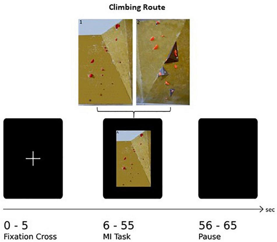 Before starting the experimental procedure, participants were shown pictures of the two boulder problems on a DIN A4 paper. These included indications for hand and foot placements at the starting holds and at the top. Participants were asked if it was possible for them to imagine climbing toward the top including hand and foot movements to ensure the participants fluent MI performance during the task and hence, enable a useful contribution to meet this study’s purpose. Additionally, subjects were indicated to grasp two provided climbing holds for 30 s to increase their kinesthetic imagery ability in the following tasks.