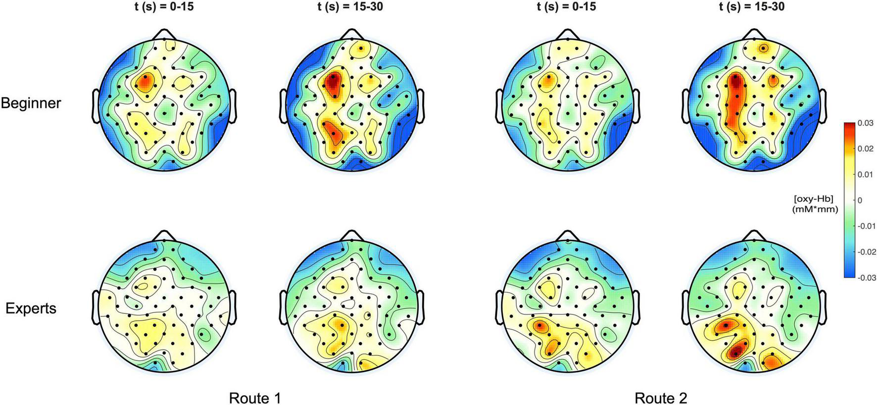 For both groups, beginners and experts, two time intervals were presented, showing the course of oxygenation from the beginning phase (0–15 s) to the end phase (15–30 s) of the task.