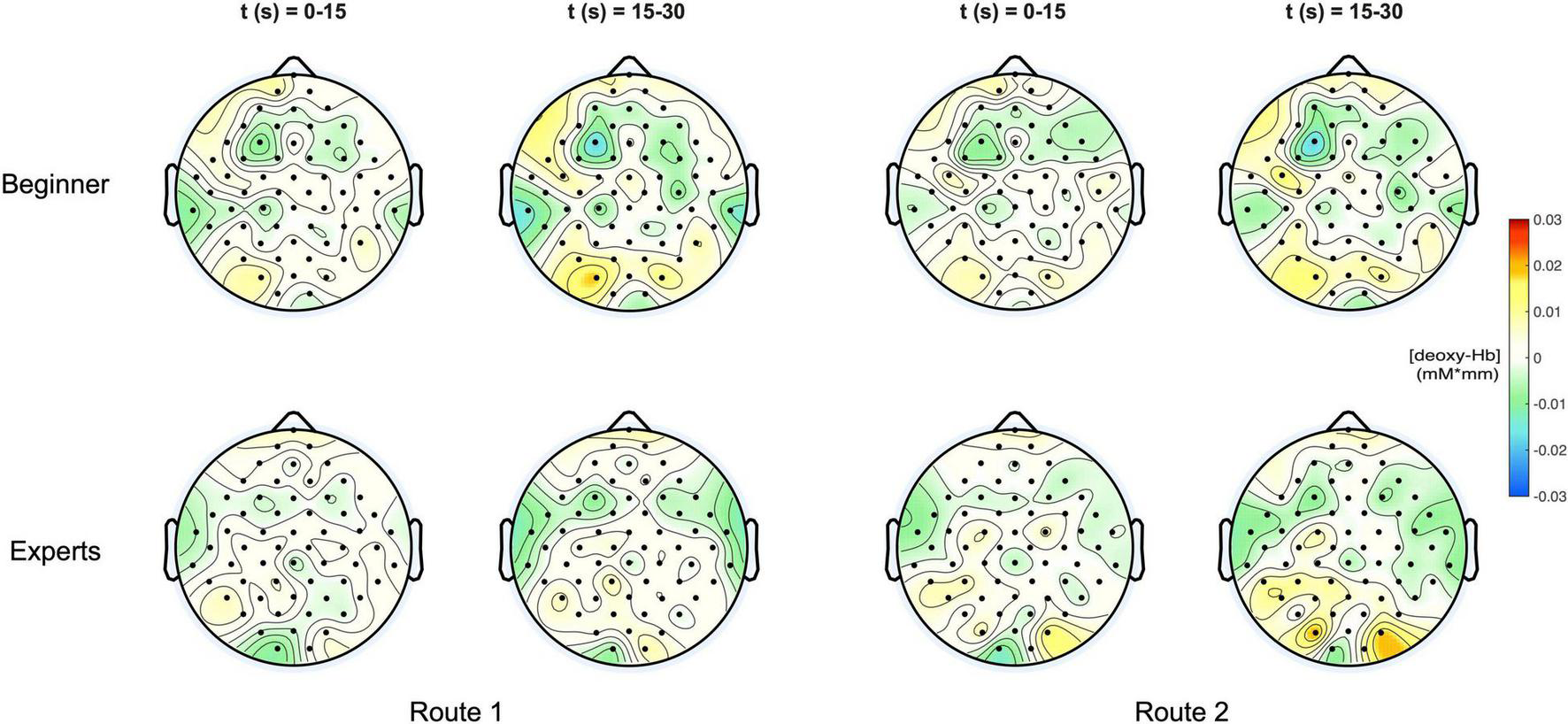 (Top) Topoplots of the mean deoxy-Hb concentration changes for beginners during MI of both routes (left side: Route 1 = easy; right side: Route 2 = difficult) and two time windows (0–15 s and 15–30 s). (Bottom) Topoplots of the mean deoxy-Hb concentration changes for experts during MI of both routes (left side: Route 1 = easy; right side: Route 2 = difficult) and two time windows (0–15 s and 15–30 s).