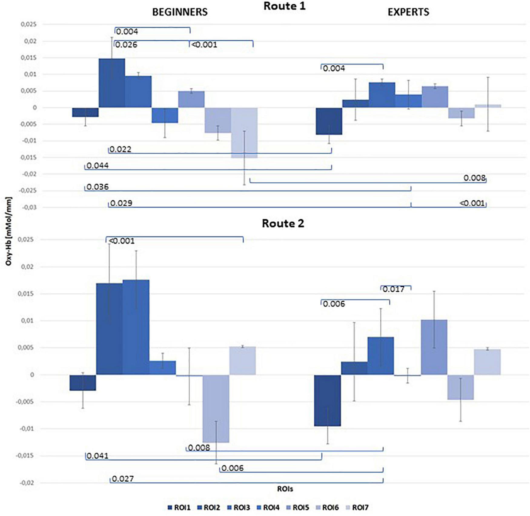 Bar chart of mean [oxy-Hb] concentration changes for both groups (left: Beginners; right: Experts), all 7 ROIs and both Routes: top level: Route 1 = easy; bottom level: Route 2 = difficult. Significant results of post hoc comparisons between beginners and experts were indicated with Tukey-test corrected p-values (α = 0.05).