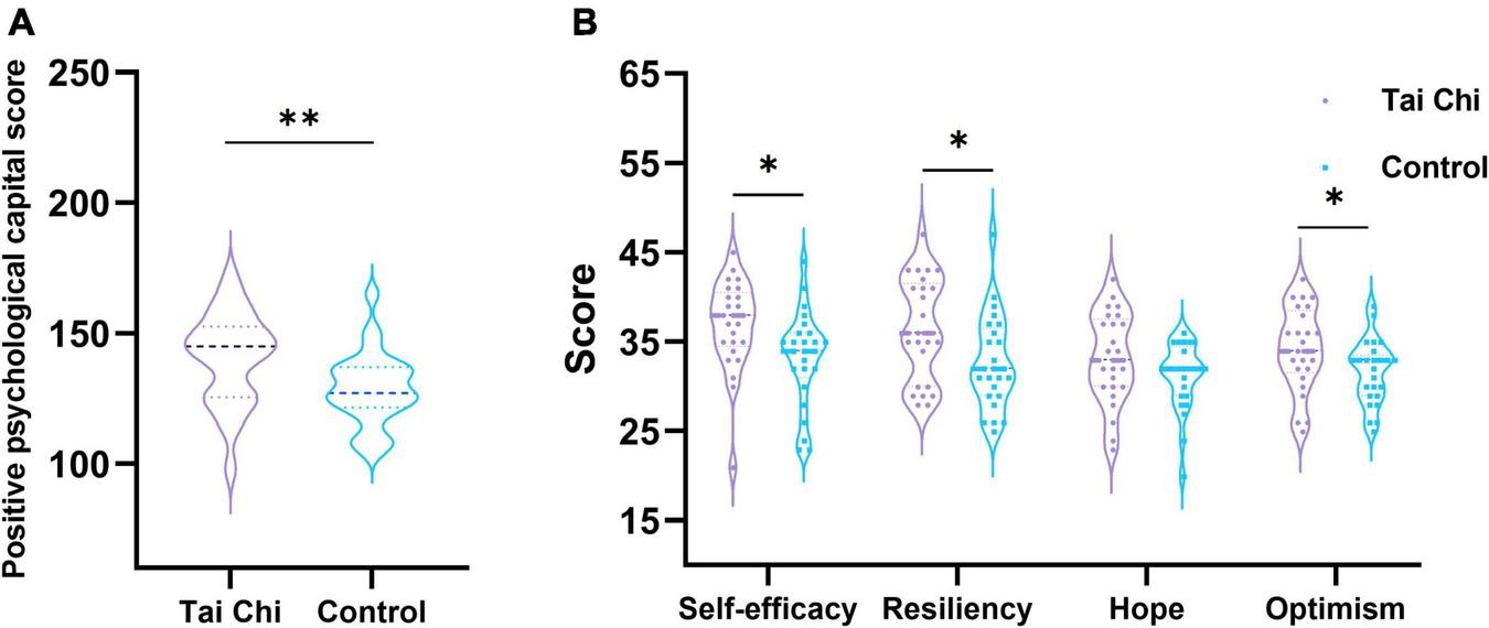 Analysis of psychological questionnaire scores in TC group and control group. (A) The score difference of positive psychological capital questionnaire between groups. (B) Inter group score difference of four core components. *Indicated significant difference between groups, p < 0.05, **indicated significant difference between groups, p < 0.01.