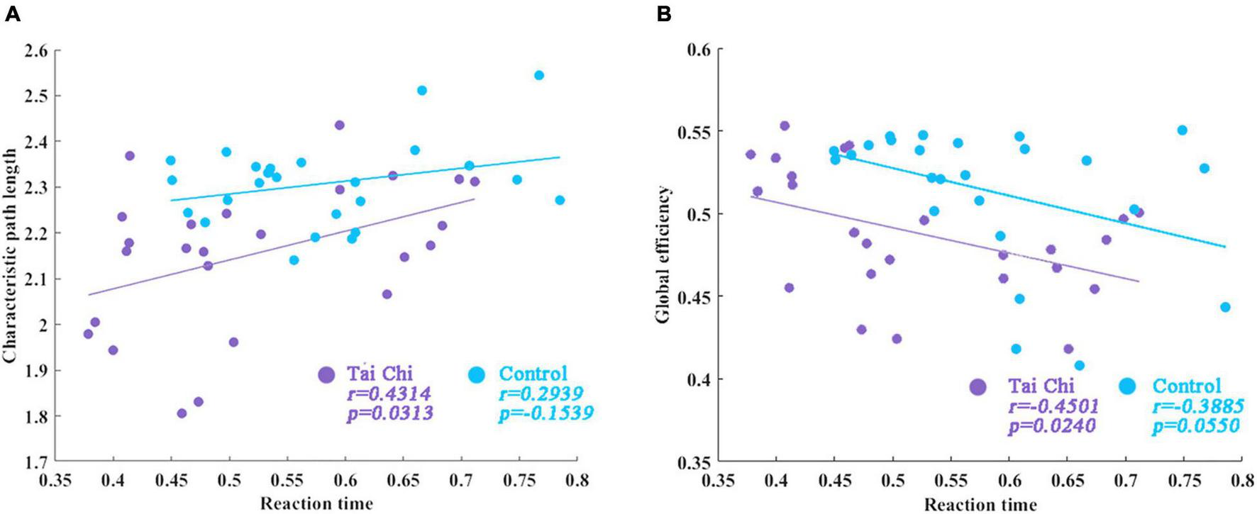 The correlation between reaction time and global network topological properties. (A) The correlations between response time and characteristic path length of subjects in TC group. (B) Correlation between reaction time and global efficiency in the TC group.