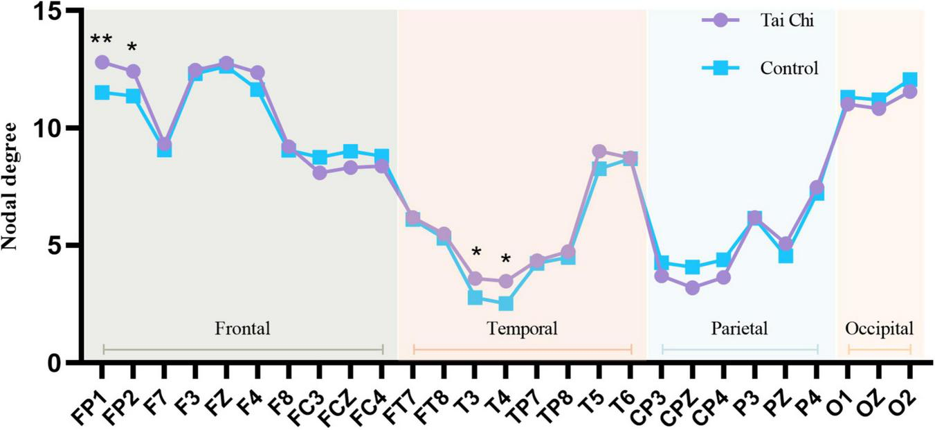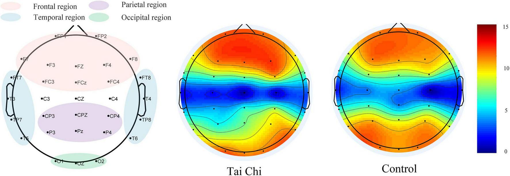 The alpha band analysis of EEG showed that TC practice significantly improved the activation of the prefrontal lobes of the practitioners, enhanced functional neuroplasticity of the brain (Cui et al., 2021), and also increased the reaction speed of the practitioners.