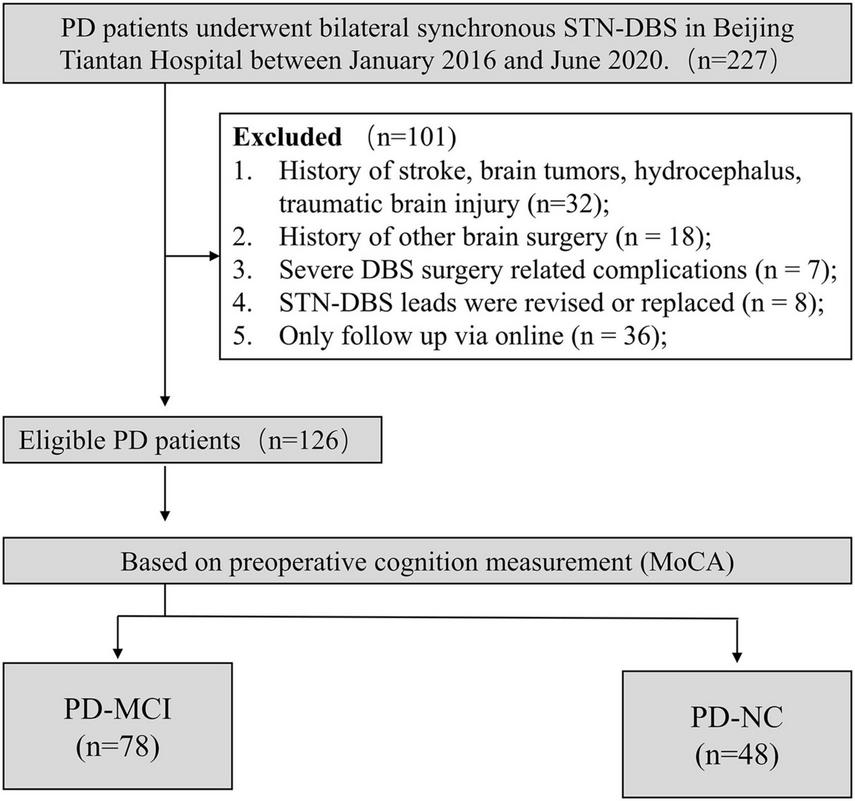 This was a retrospective cohort study that included 126 PD patients who underwent STN-DBS; all patients completed cognitive and motor assessments before and at least 6 months after surgery. Cognitive changes were mainly evaluated by the Montreal cognitive assessment (MoCA) scale and the seven specific MoCA domains, including visuospatial/executive function, naming, attention, language, abstract, delayed recall, and orientation. Motor improvement was evaluated by the UPDRS-III. Cognitive changes and motor improvements were compared between PD-MCI and normal cognitive (NC) patients. Logistic regression analyses were performed to explore predictors of post-operative cognitive change.