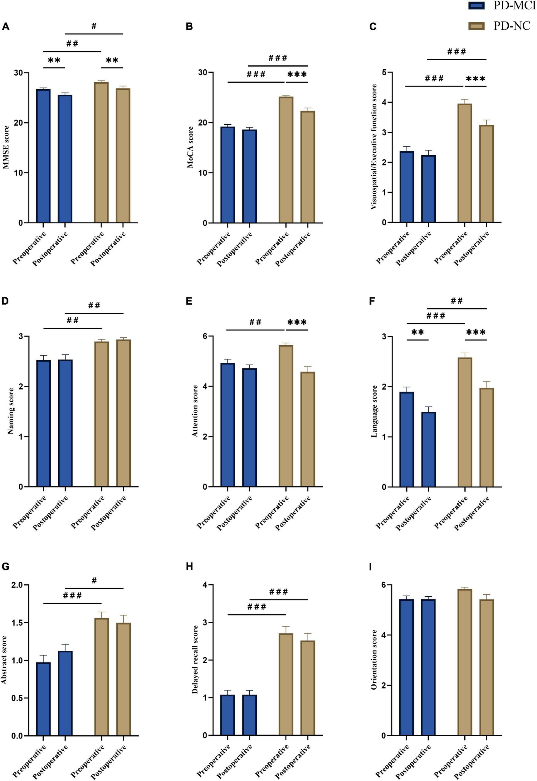 Comparison of pre- and post-operative cognitive scores between groups. Compare to pre-operative, (A) overall MMSE scores (PD-MCI: **p = 0.002; PD-NC: **p = 0.006) and language scores (PD-MCI: **p = 0.001; PD-NC: ***p < 0.001) showed decline in PD-MCI and PD-NC groups. (B) Overall MoCA scores (***p < 0.001), (C) visuospatial/executive function (***p < 0.001) and (E) attention (***p < 0.001) showed significant post-operative decline in PD-NC group. Compare to PD-NC group, PD-MCI group showed lower score in (A) overall MMSE (pre-operative: ##p = 0.009; post-operative: #p = 0.02), (B) overall MoCA (pre-operative: ###p < 0.001; post-operative: ###p < 0.001), (C) visuospatial/executive function (pre-operative: ###p < 0.001; post-operative: ###p < 0.001), (D) naming (pre-operative: ##p = 0.007; post-operative: ##p = 0.003), (F) language (pre-operative: ###p < 0.001; post-operative: ##p = 0.004), (G) abstract (pre-operative: ###p < 0.001; post-operative: #p = 0.013), and (H) delayed recall (pre-operative: ###p < 0.001; post-operative: ###p < 0.001) in both pre- and post-operative, and (E) attention (##p = 0.003) in pre-operative. No significant difference was found in orientation (between pre- and postoperative within-group, or between-groups) (I). The data were analyzed by two-way repeated-measures ANOVA with group (PD-MCI and PD-NC) as the between group factor and time (before and after DBS) as the within group factor, followed by Bonferroni’s post-hoc tests. All graphs are depicted with bars for standard errors of the mean (SEM) and p-values (two-tailed) with the following significance level: **p < 0.01; ***p < 0.001 (within-group comparison); #p < 0.05; ##p < 0.01; ###p < 0.001 (between-group comparison). PD-MCI, Parkinson’s disease with mild cognitive impairment; PD-NC, Parkinson’s disease with normal cognition; MoCA, Montreal Cognitive Assessment; MMSE, Mini-Mental State Examination.