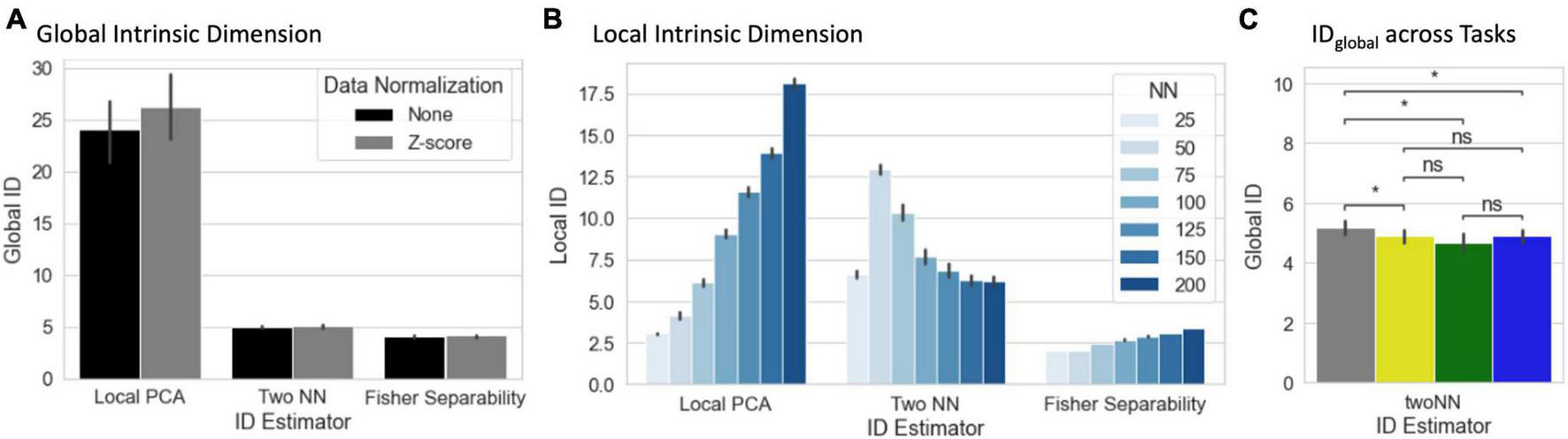 Figure 5. (A) Summary view of global ID estimates segregated by estimation method (local PCA, two nearest neighbors, and Fisher separability) and normalization approach (none or Z-scoring). Bar height corresponds to average across scans, bars indicate 95% confidence intervals. (B) Summary view of local ID estimates segregated by estimation method and neighborhood size (NN = number of neighbors) for the non-normalized data. (C) Statistical differences in global ID across tasks (*pFDR < 0.05) (gray, rest; yellow, visual attention; green, math; and blue, 2-back).