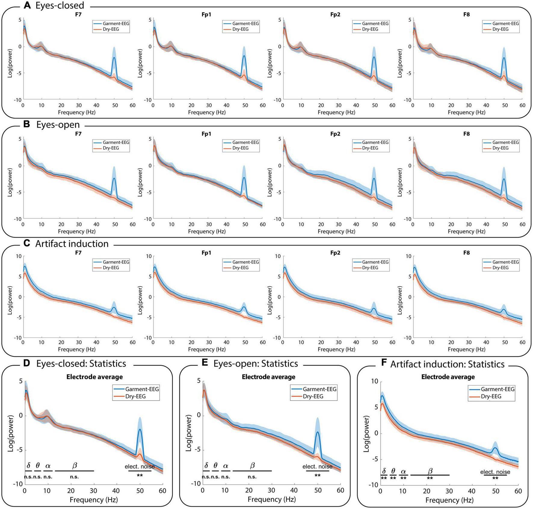 Figure 5. Frequency analysis. Power spectral density comparison between the EEG activity measured with the Garment-EEG and Dry-EEG during (A) eyes-closed, (B) eyes-open, and (C) artifact induction. In panels (A–C), each subplot displays one of the four forehead electrodes (F7, Fp1, Fp2, and F8). Statistical comparisons between both headbands on five frequency bands during (D) eyes-closed, (E) eyes-open, and (F) artifact induction. n.s., non-significant; **p < 0.01.