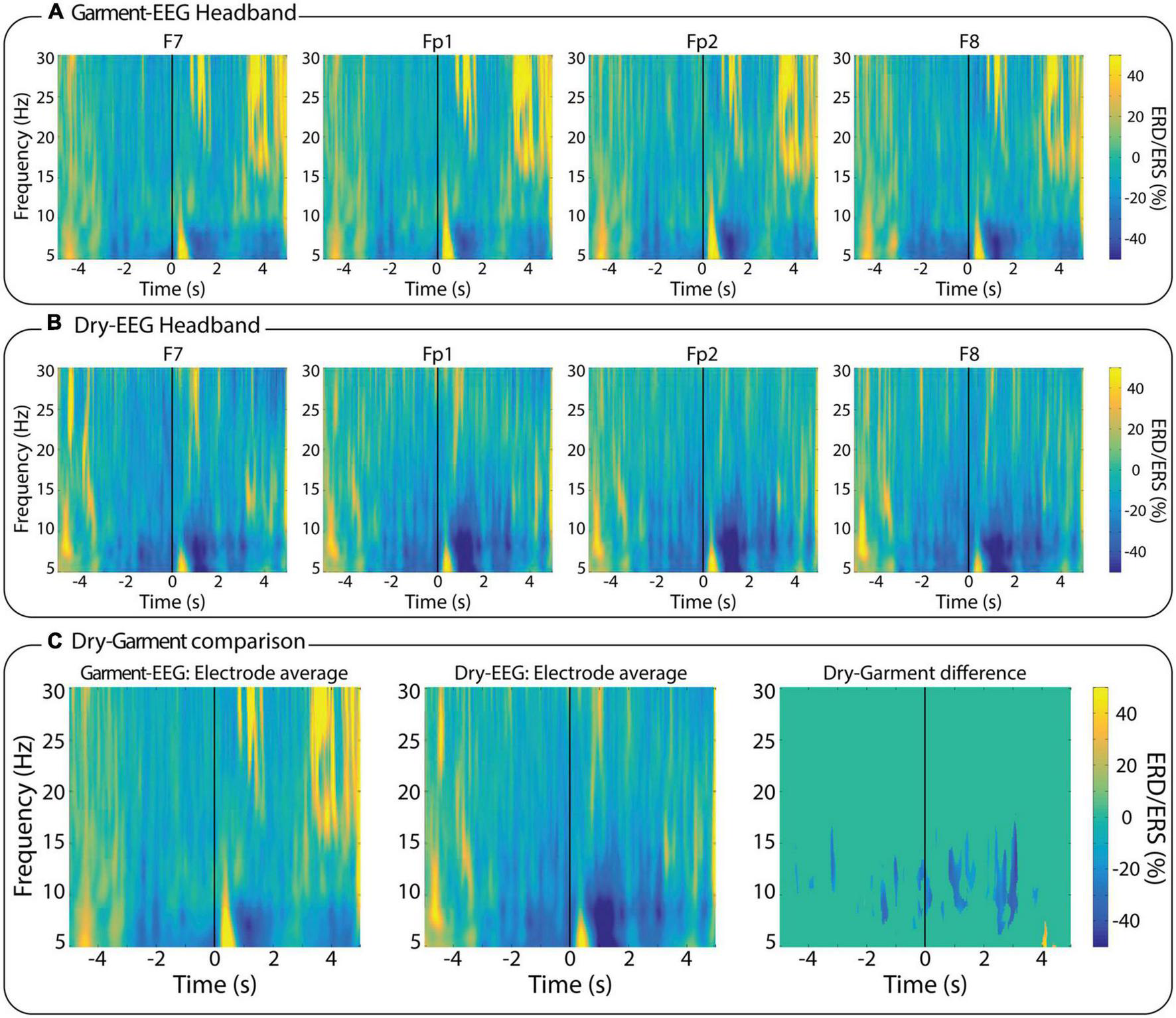 Figure 6. Time-frequency analysis. Event-related (de)synchronization (ERD/ERS) maps of the EEG activity measured during the reaching movements with (A) the Garment-EEG headband, and (B) the Dry-EEG headband. Each subplot in panels (A,B) displays one of the four forehead electrodes (F7, Fp1, Fp2, and F8). (C) Comparison between the two technologies; (left) average of all the Garment-EEG electrodes, (center) average of all the Dry-EEG electrodes, (right) pairwise statistical comparison between both headbands.