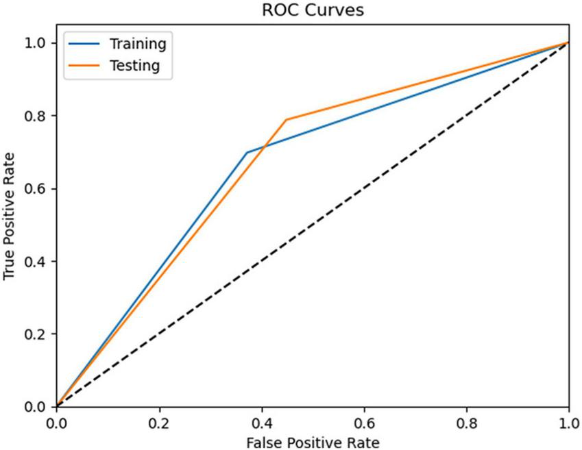 The testing phase was performed only for the best performing model, SVM, for which we evaluated its performance using an independent set of data (30%) from the training set. The results show an accuracy of 70%, highlighting the model’s ability to correctly classify most of the cases in the test set (see Table 4). AUC-ROC is 0.67, indicating a fair result (see Figure 4). The model is able to correctly identify to make predictions about predicted positives (precision = 74%) and correctly identify true positives (sensitivity = 79%) but can identify true negatives less (specificity = 55%). Overall, the testing results show that our SVM model can provide accurate predictions, especially for cases (i.e., aMCIc).