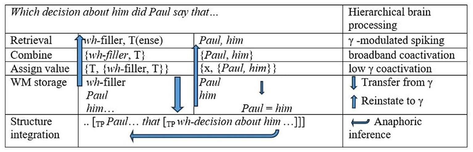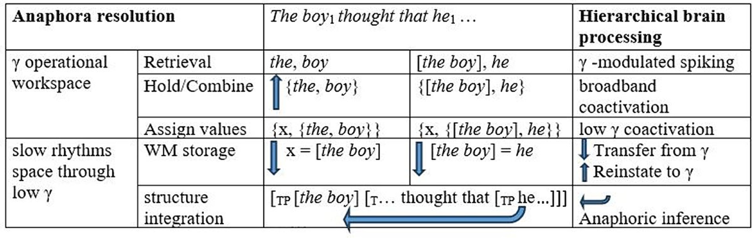 Neurofunctional processes in structure-based anaphora resolution. WM = working memory. Arrows going up indicate the coactivation of cell ensembles for representations in gamma as is required in reinstatement. Arrows going down indicate interactions with slow rhythms.