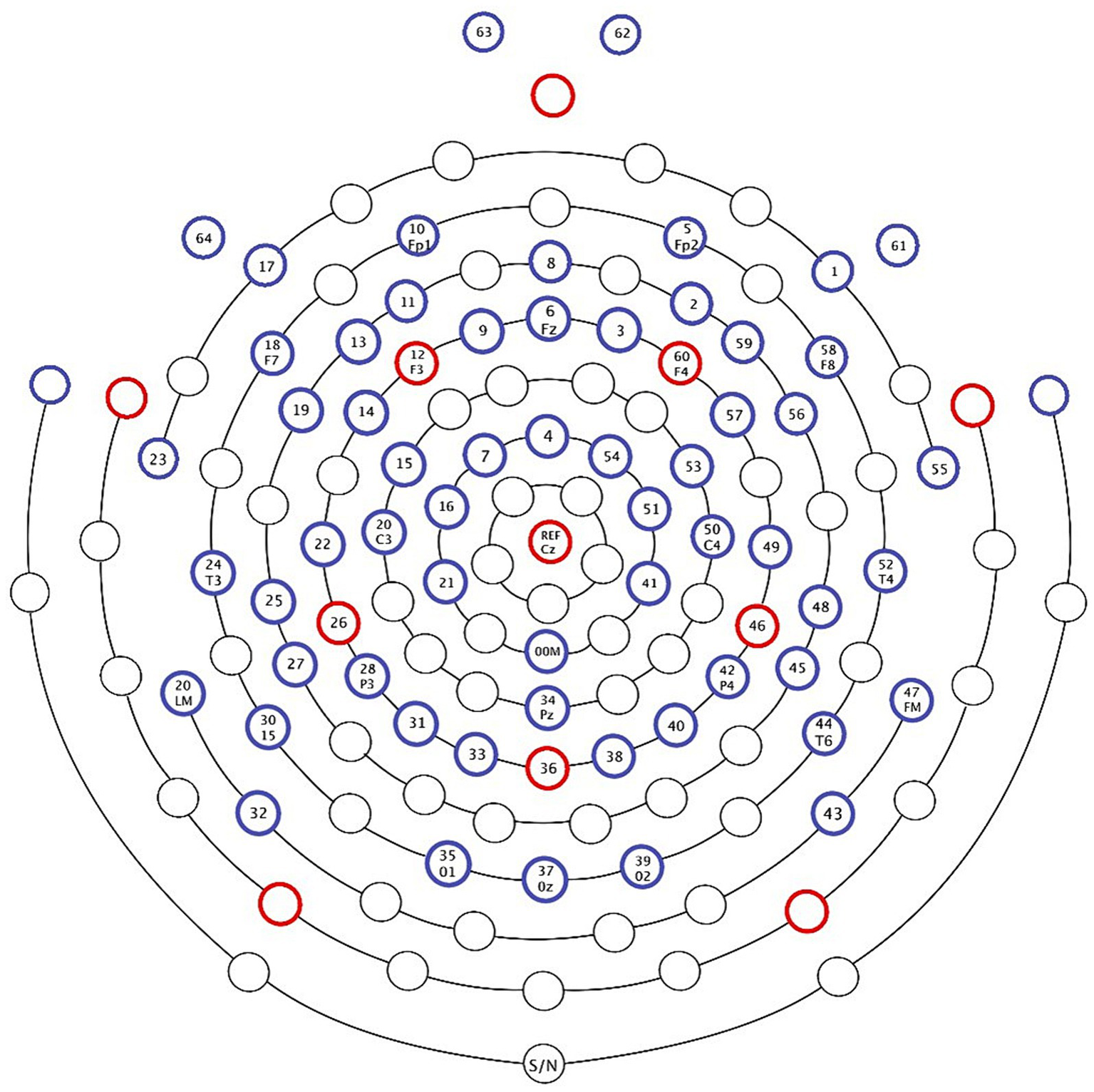 EEG was recorded at a 1,000 Hz sampling rate via a 64-electrode EGI system (Electrical Geodesics Inc., Eugene, OR; Figure 3) referenced to Cz (vertex) online. The signal was collected using a Net Amps 300 amplifier with a gain of 5,000 and acquisition software NetStation (version 4.5.4). Impedances were verified to be below 50 kΩ before each of the four blocks in the task. All preprocessing and data cleaning procedures were performed using the EEGLAB toolbox based on MATLAB (version 9.5) (Delorme and Makeig, 2004). An 8-ms latency shift due to the amplifier was corrected before preprocessing. Line noise was removed using the CleanLine plugin for EEGLAB (Mullen, 2012). The continuous data were then divided into 5.2-s epochs starting with est-ce que (the question marker) and running to the end of the sentence. Following segmentation, we visually inspected each epoch for bad channels, and if a channel was bad in more than 10% of epochs, we removed the whole channel. It has been demonstrated that muscle activity can create noise in high-frequency EEG measures, and γ-band results should thus be reported and interpreted with caution (e.g., Yuval-Greenberg et al., 2008). Hipp and Siegel (2013) showed that removing such artifacts from the EEG recording by rejecting data sections affected by artifactual signals or independent component analysis (ICA) can allow for a more confident analysis of high-frequency EEG. Therefore, we visually inspected each epoch and systematically removed any epoch including unexpected EMG activity (i.e., furrowing of the brow, face, and neck movements, but not blinks). We used the binica algorithm for ICA to extract and then manually check the 32 most impactful components generated by principal component analysis (PCA) so that we could effectively remove the remaining ocular and cardiac activity, among any remaining artifacts; 12 additional participants with greater than 10% bad channels or greater than 30% bad epochs were excluded from the analysis, leaving the 24 L1 and 24 L2 speakers described above. An average of 85% of trials was retained across subjects (SD = 2.20). The average number of trials retained was similar across conditions, (1a), M = 21.31, SD = 2.23; (1b), M = 21.06, SD = 2.02; (1c), M = 21.17, SD = 2.42; (1d), M = 21.27, SD = 2.12; p = 0.91, with no differences across groups (NS: M = 21.21, SD = 2.13; L2 speakers: M = 21.20, SD = 2.28, p = 0.93). For L1 speakers, 290 components were rejected, for an average of 12 per subject; for L2 speakers, 345 components were rejected, for an average of 14 per subject; and for the whole population, 635 components were rejected, for an average of 13 per subject. These may seem at first like high numbers of components to remove. However, our 5.2-s epochs are much longer than in most research, and longer epochs are likely to contain more noise than shorter ones. Because component removal for artifacts may risk removing some brain activity, the procedure is conservative in terms of finding effects. No significant difference arose between groups in the number of components removed (p = 0.35). The data were average referenced, and missing channels were interpolated for the time-frequency analysis.