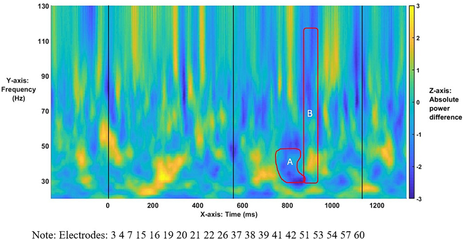 The time–frequency plot of absolute power differences for the entire population (Figure 4) shows virtually no overlap between Effects A and B (only 5 ms as shown in Table 2), indicating a narrowband effect in low γ that ends as the broadband effect across γ starts. For the broadband effect, Figure 4 suggests that the power-based differences arise largely in high-/mid-γ frequencies, as indicated by the darker blue, with lesser differences in the lower γ frequencies.