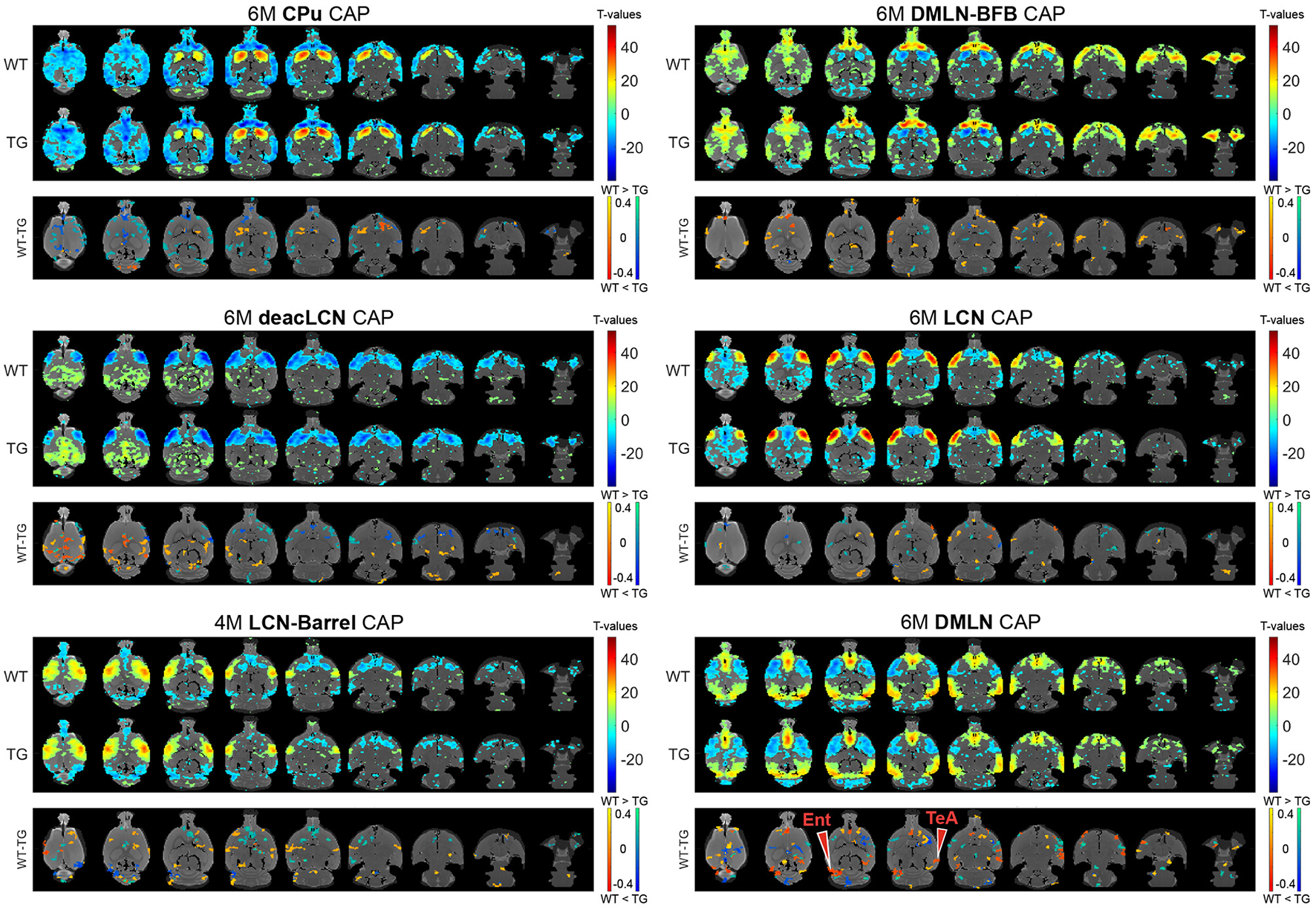 We conducted a two-tailed, one-sample T-test (Bonferroni corrected, p < 0.01) to identify significantly activated or deactivated voxels, for each CAP, using its occurrences in the combined image-series and its respective age-specific WT or TG sections. One-sample T-statistics for significant voxels were visualized as a brain-wide map for each CAP.