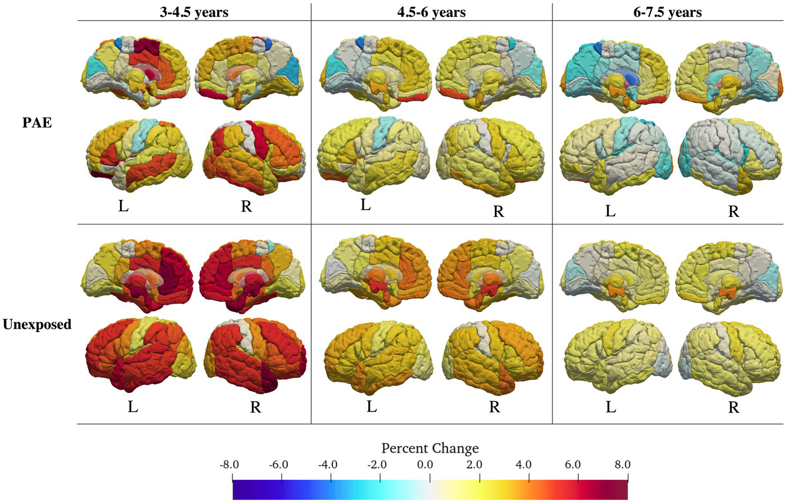 | Region | 3–4.5 years | 4.5–6 years | 6–7.5 years | 3–4.5 years | 4.5–6 years | 6–7.5 years | PAE | Unexposed | Difference (unexposed-PAE) | Average percent larger in Unexposed or (PAE) |
