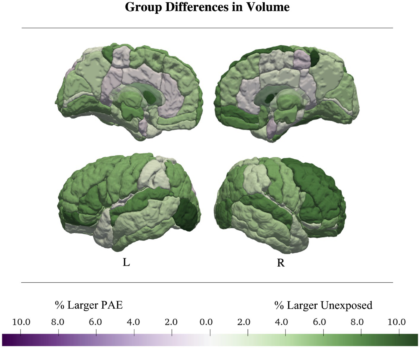 Previous MRI studies have found widespread structural brain differences in individuals with PAE as compared to unexposed individuals. This includes smaller total brain, white matter, and gray matter volume (see Lebel et al., 2011; Donald et al., 2015 for reviews). Smaller gray matter volumes have been reported for the caudate (Mattson et al., 1996; Archibald et al., 2001; Cortese et al., 2006; Astley et al., 2009; Nardelli et al., 2011), pallidum and putamen (Nardelli et al., 2011; Roussotte et al., 2011; Treit et al., 2013), and the basal ganglia more broadly (Mattson et al., 1996), as well as the hippocampus (Willoughby et al., 2008; Astley et al., 2009; Nardelli et al., 2011; Treit et al., 2013), thalamus (Mattson et al., 1992; Nardelli et al., 2011; Treit et al., 2013), and frontal, temporal, and parietal cortex (Astley et al., 2009; Chen et al., 2012; Rajaprakash et al., 2014).