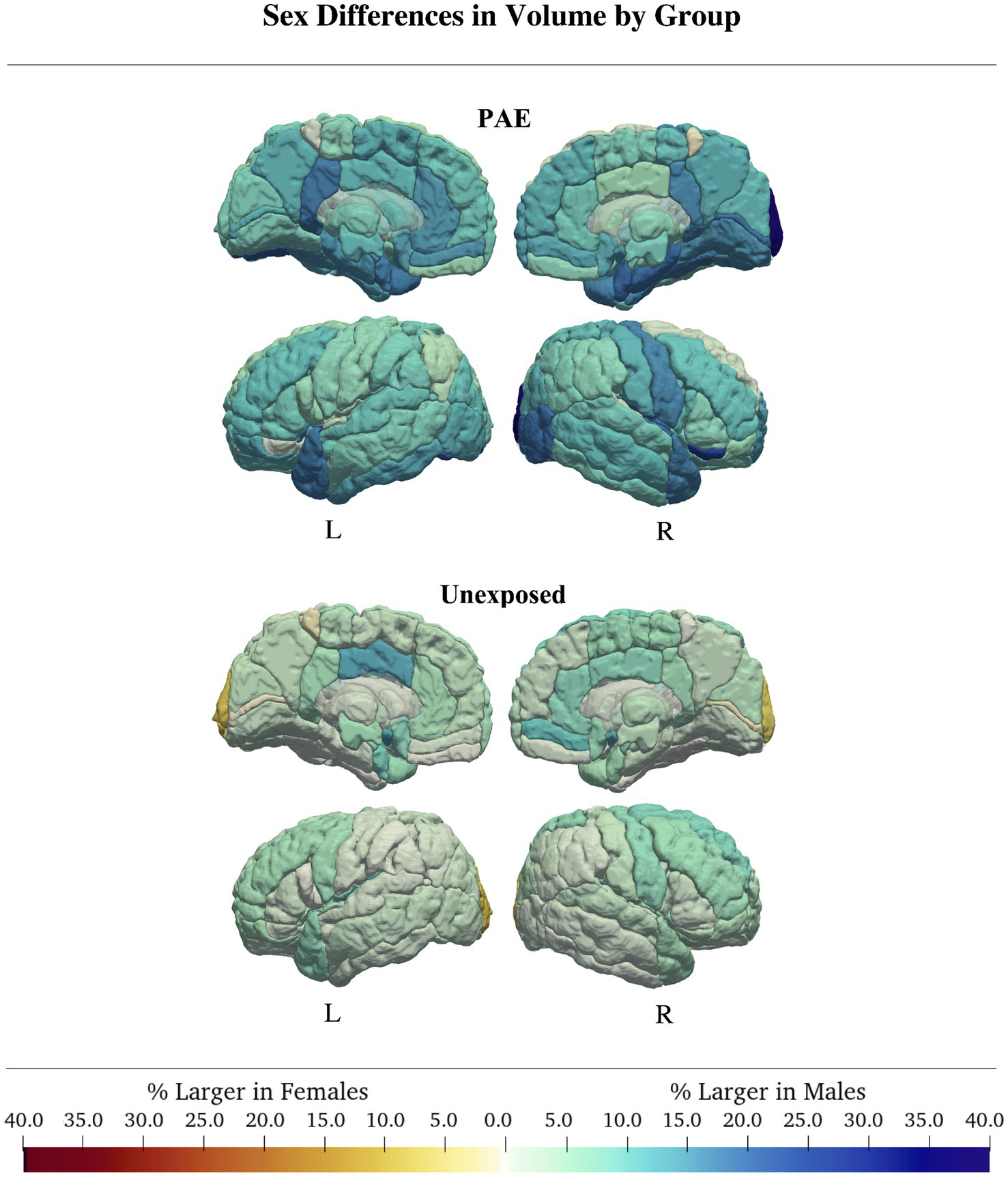 PAE has also been associated with sex differences in brain volume, neurogenesis, and hypothalamic–pituitary–adrenal (HPA) axis function (see reviews by Terasaki et al., 2016 and Weinberg et al., 2008). With respect to brain structure in children with PAE, sex appears to play an important role. For example, Nardelli et al. (2011) found fewer regional volume differences between males and females with PAE as compared to an unexposed group, where males had larger gray matter than females. Others have found that the magnitude of volume reductions in samples with PAE vary by sex. Treit et al. (2017) found males with PAE had 12–17% smaller volume in the thalamus, putamen, and caudate than unexposed males, whereas females with PAE had 7–12% smaller volumes than unexposed females (Treit et al., 2017). Similarly, Subramoney et al. (2022) found that males with PAE had significantly smaller putamen volume than unexposed males while females from both groups had similar putamen volume (Subramoney et al., 2022). There are no major sex differences in the types of FASD diagnosis (i.e., FASD with sentinel facial features versus FASD without sentinel facial features) or the physical characteristics of FASD, but the prevalence of various mental health and cognitive outcomes varies for males and females with PAE. While no sex differences were noted in the preschool years, male children, adolescents, and adults with PAE show higher rates of ADHD, conduct disorder, oppositional defiant disorder, and motor, memory, attention, executive function, and adaptive functioning impairment, while females show higher rates of anxiety and depressive/mood disorders (Flannigan et al., 2023). Thus, further examinations of sex differences in the brain in individuals with PAE may elucidate sex-specific neural characteristics underlying differential outcomes neurodevelopmental, behavioral, and mental health outcomes.