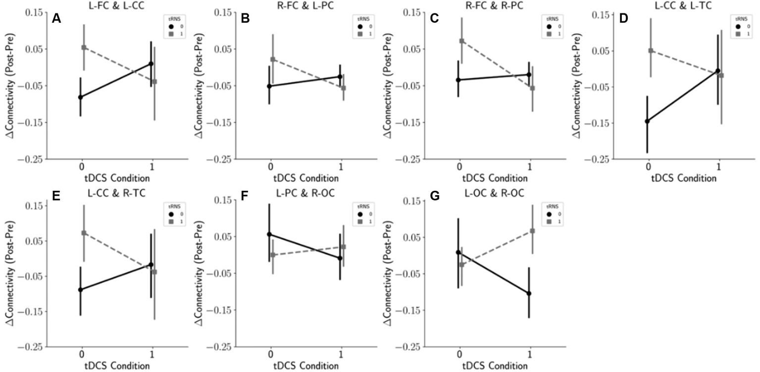 Interaction effects of tDCS and tRNS on the connectivity changes. This figure illustrates the interaction effects based on the results of a two-way repeated measures ANOVA. Panels (A–G) display selected brain region pairs where p-values fell below the 0.1 threshold, indicating notable interaction effects between tDCS and tRNS. (A) Interaction effect between the left frontal cortex (L-FC) and the left central cortex (L-CC). (B) Interaction between the right frontal cortex (R-FC) and the left parietal cortex (L-PC). (C) Interaction between the right frontal cortex (R-FC) and the right parietal cortex (R-PC). (D) Interaction between the left central cortex (L-CC) and the left temporal cortex (L-TC). (E) Interaction between the left central cortex (L-CC) and the right temporal cortex (R-TC). (F) Interaction between the left parietal cortex (L-PC) and the right occipital cortex (R-OC). (G) Interaction between the left occipital cortex (L-OC) and the right occipital cortex (R-OC).