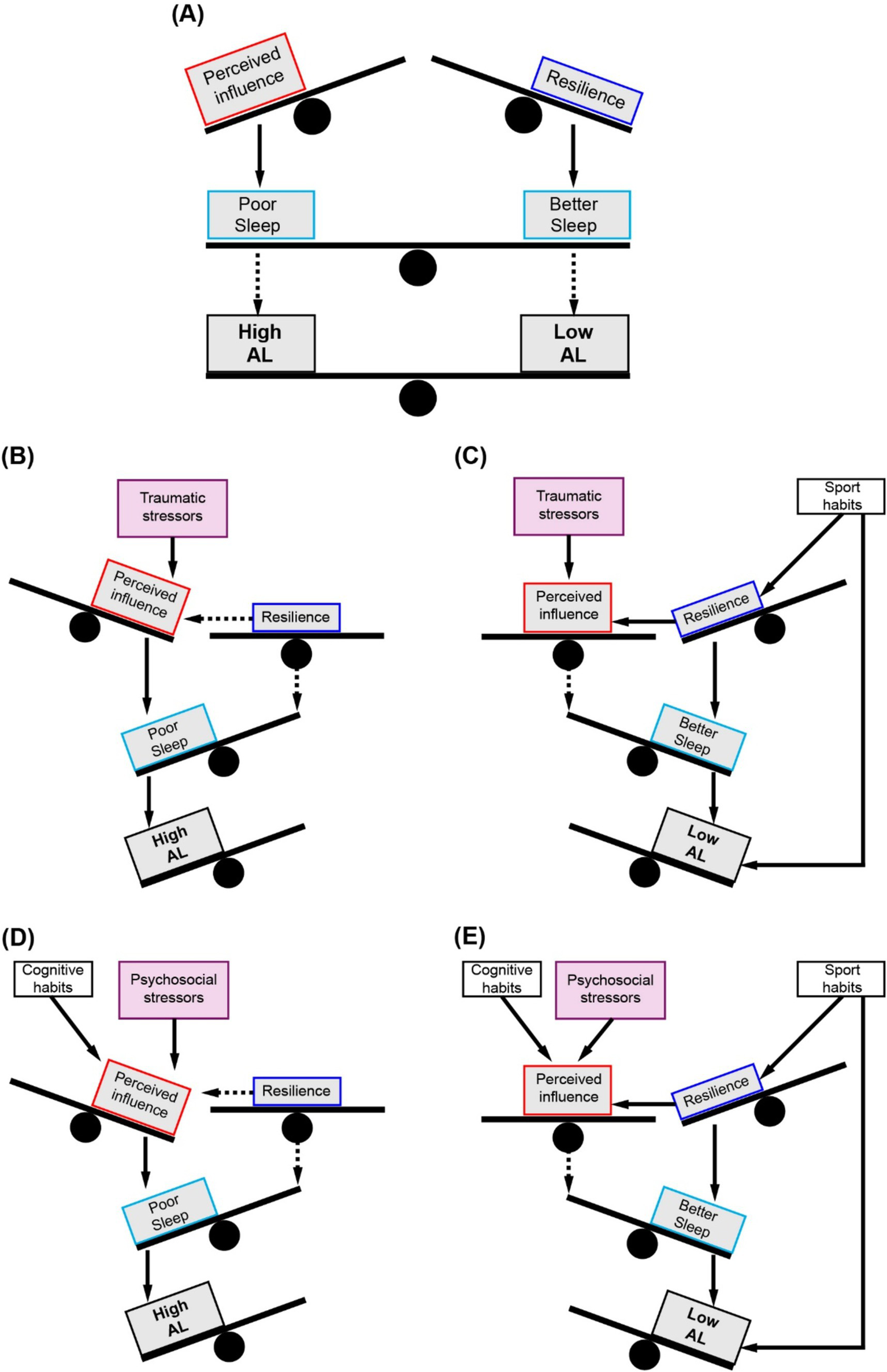Direct effects of sports and diet on AL, and on resilience by sports were found in all the evaluated models. The modulation of AL by both types of stressors was only revealed in model 2, through indirect effects of perceived influence via sleep quality. An effect of sport habits on AL via resilience was found to be mediated by sleep, and equivalent but opposed effects of perceived influence of stressors and resilience on sleep quality emerged as critical factor for AL modulation.