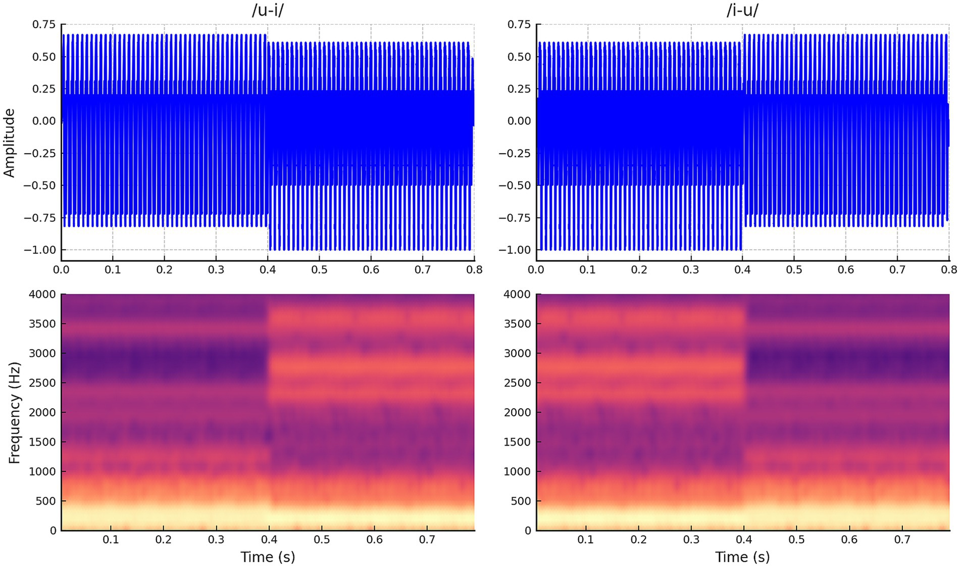 Figure 1. Waveforms and spectrograms for stimuli. This stimulus includes two vowel sounds that change halfway through (400 ms after onset) from /i/ to /u/ and vice versa from /u/ to /i/.