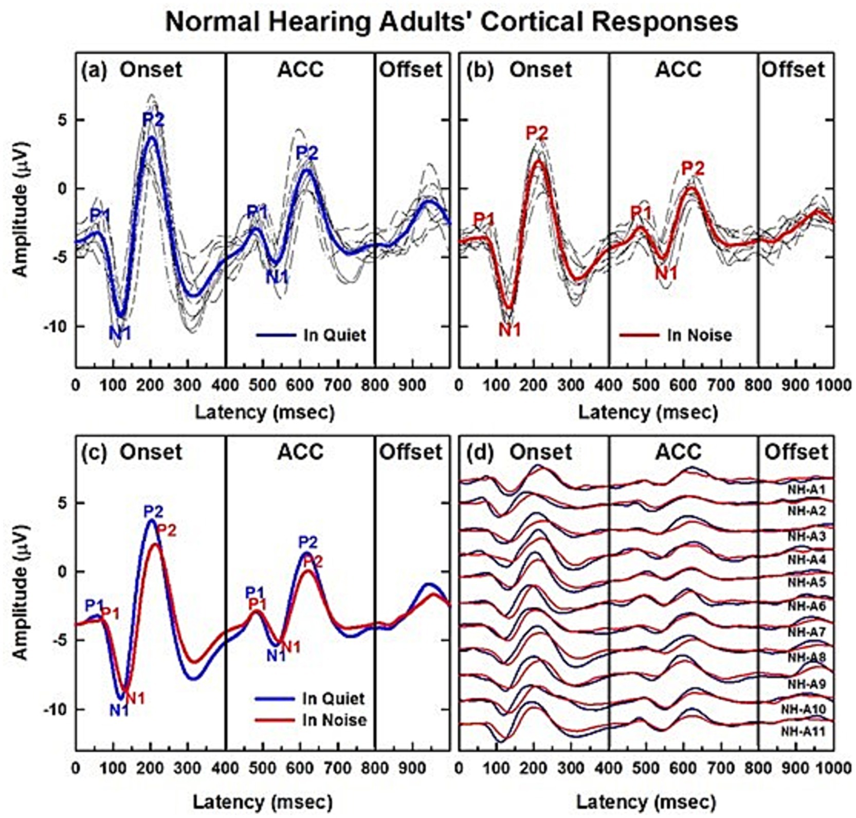 Figure 2. CAEPs of normal hearing adult listeners in quiet and noise conditions. (a,b) Show cortical responses obtained from eleven NH adults. (a,b) Show onset and ACC responses obtained in quiet and background noise (+10 dB SNR using speech-shaped noise) conditions, respectively. Individual data are shown in black and grand average waveforms in blue and red for each listening condition. (c,d) Compare the two listening conditions in grand average waveforms and individual subjects, respectively.