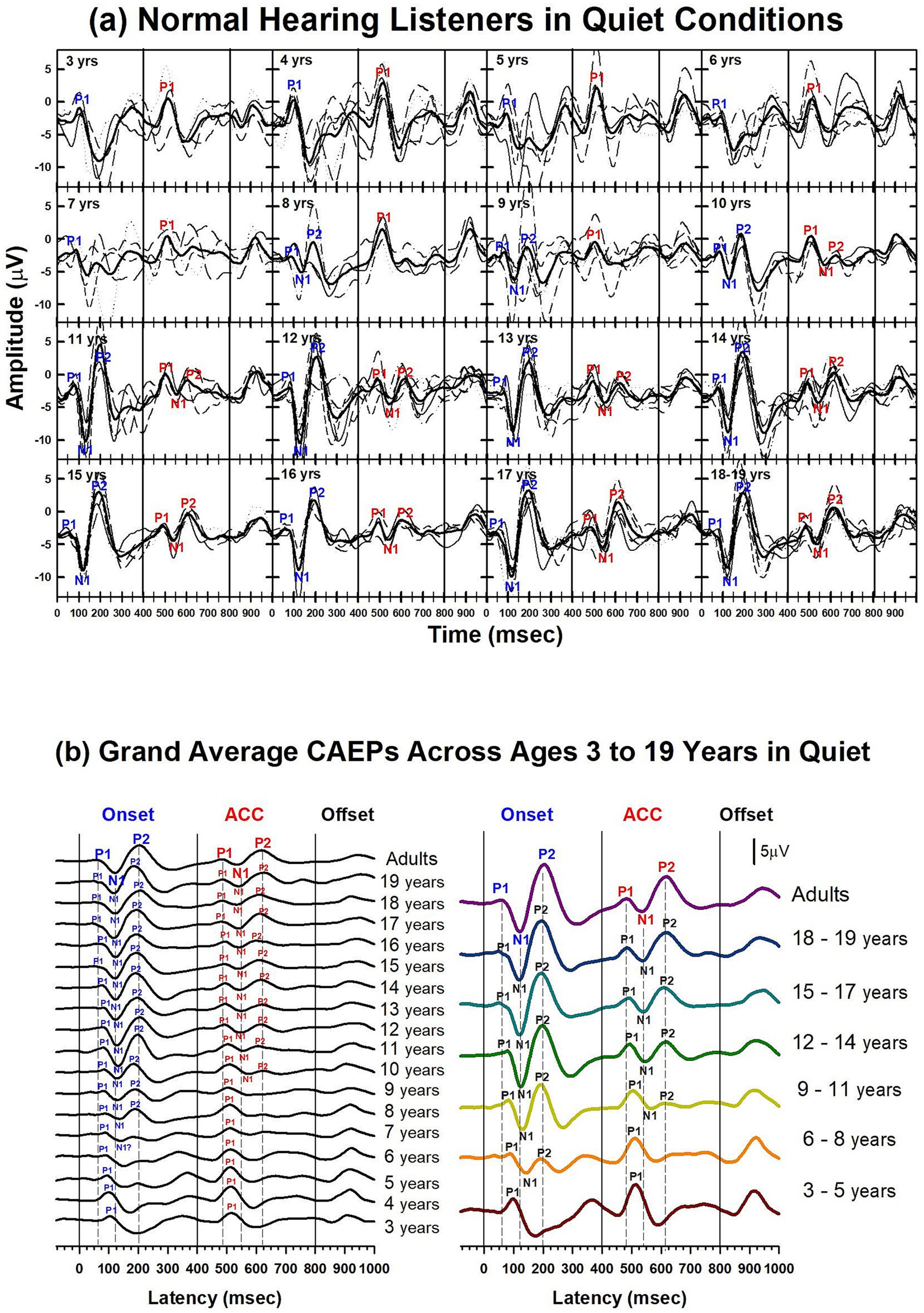 Figure 3. Waveforms of CAEPs in NH listeners in quiet. (a) Grand average CAEP waveforms recorded at electrode Cz are shown for individual age groups ranging from 3 to 19 years. Each subplot displays responses from both /u-i/ and /i-u/ stimuli combined. Thin lines represent individual recordings; thick black lines represent grand averages for each age group. Key waveform components (P1, N1, P2) are labeled at both the onset and acoustic change complex (ACC) time points. (b) Left panel: grand average CAEPs across ages 3 to 19 years and adults, showing developmental trends in response morphology over time. Right panel: age groups are collapsed into 3-year intervals to illustrate group-level developmental patterns. Onset, change, and offset of the stimulus occur at 0, 400, and 800 ms, respectively (marked by solid vertical lines). Dashed lines indicate the peak latencies of P1, N1, and P2 components in the adult group for both onset and ACC responses.